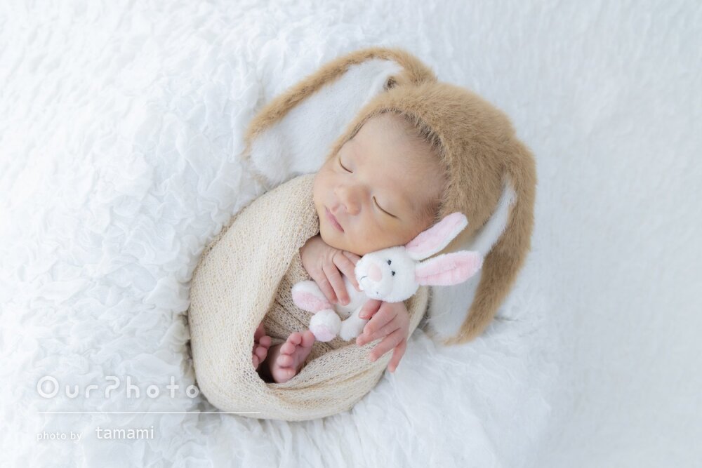 「素敵な写真」うさぎ耳帽子をかぶって可愛いニューボーンフォトの撮影