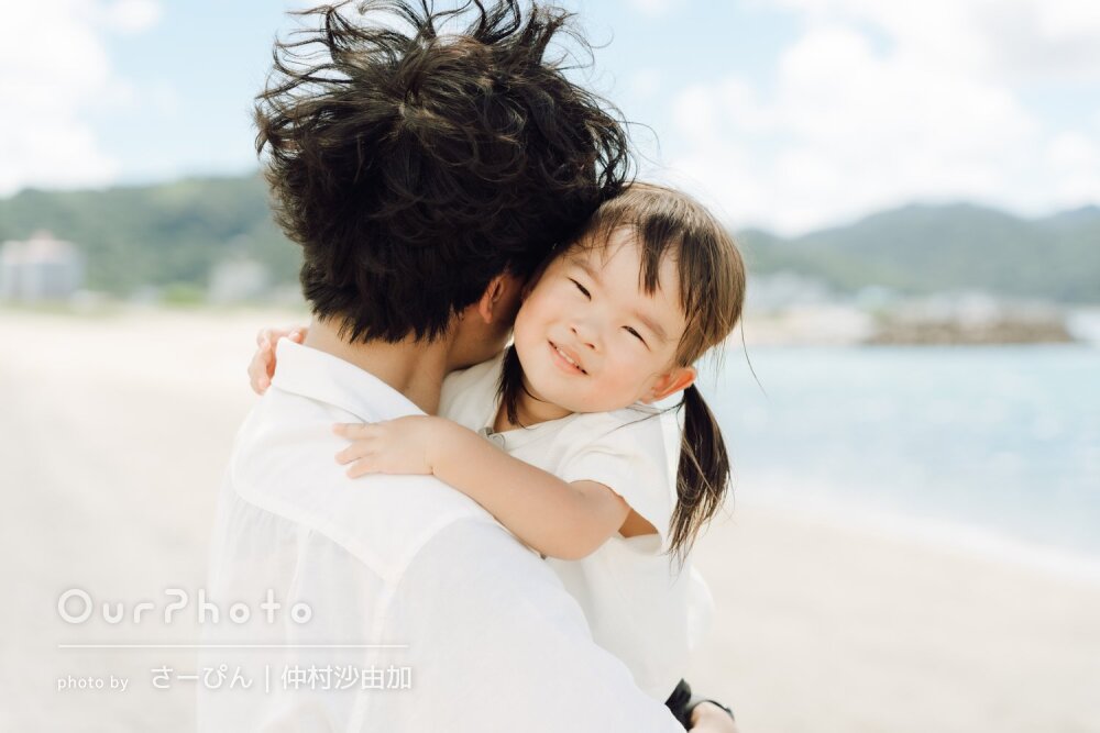 「娘の優しい雰囲気と、リラックスした笑顔」ビーチで家族写真の撮影