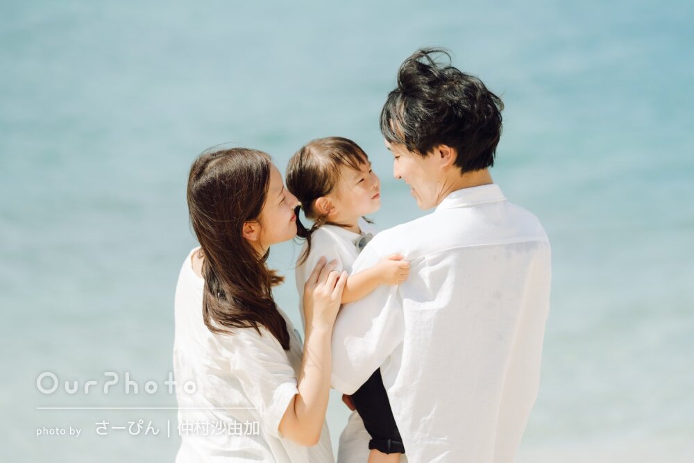 「どれも素敵な瞬間」青い海に白のリンクコーデが爽やかな家族写真の撮影
