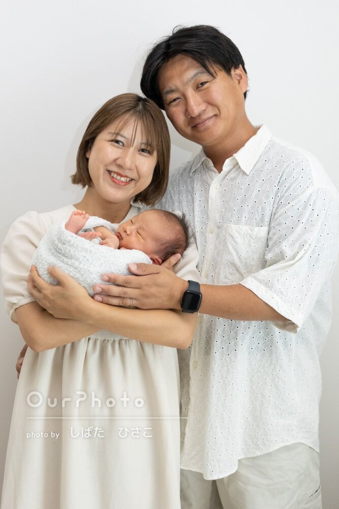 「素敵」仲良く笑顔で白のリンクコーデ!自宅でニューボーンフォトの撮影