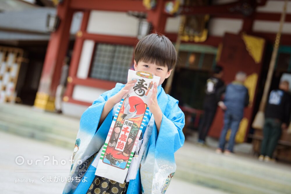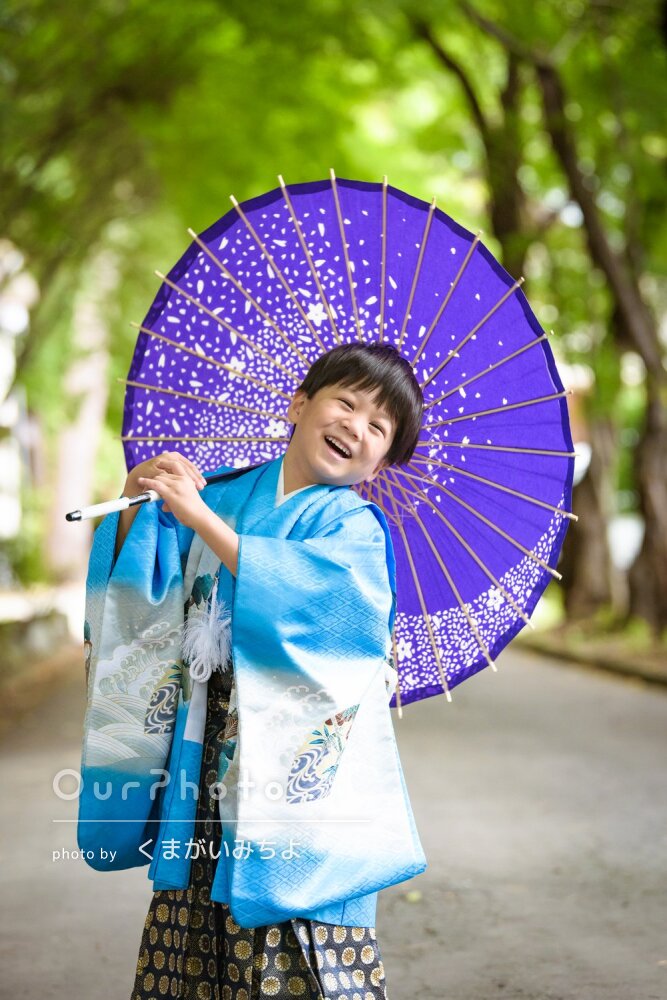 「いい笑顔の写真」リピーター様!和装の5歳男の子の神社で七五三の撮影
