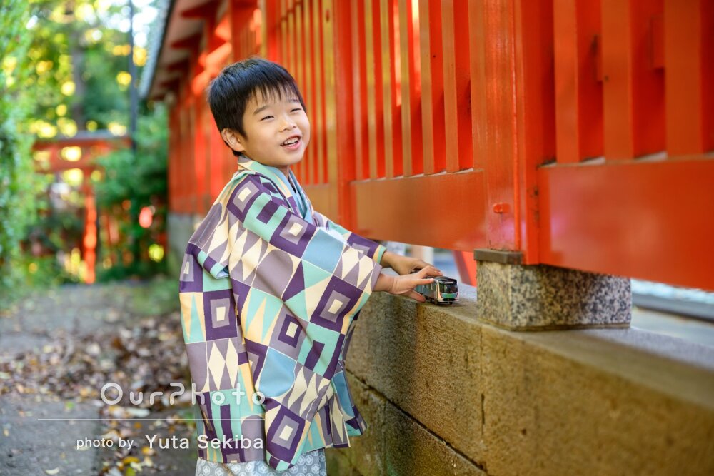 「楽しさが見えるお写真」愛らしい表情の男の子!神社で七五三の撮影