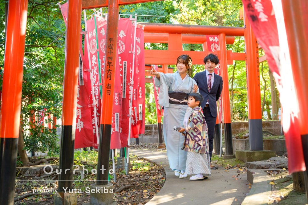 「バリエーション豊かな写真」華やかな晴れ着が境内に映える七五三の撮影
