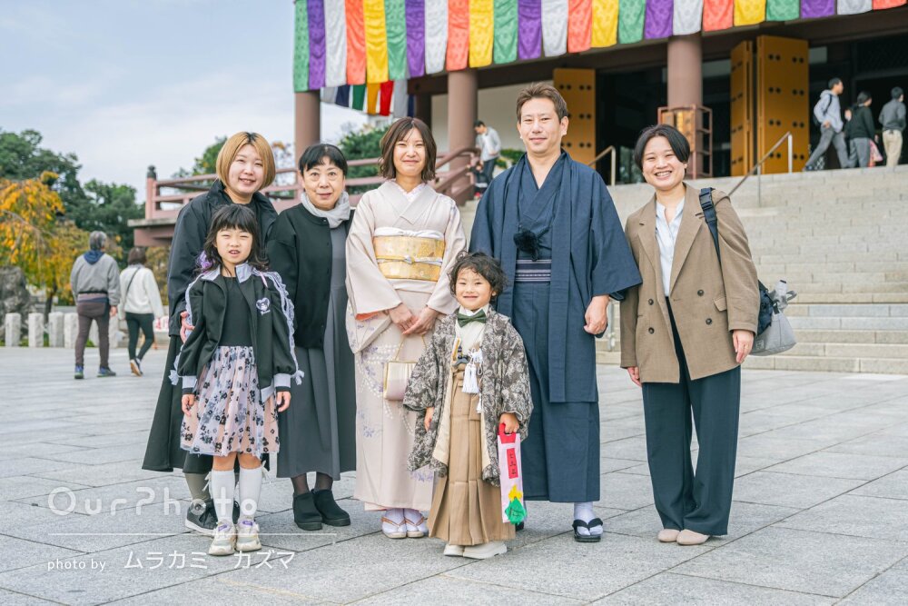 「子どもの心をグッと掴んで」大人数で賑やか!神社で男の子七五三の撮影
