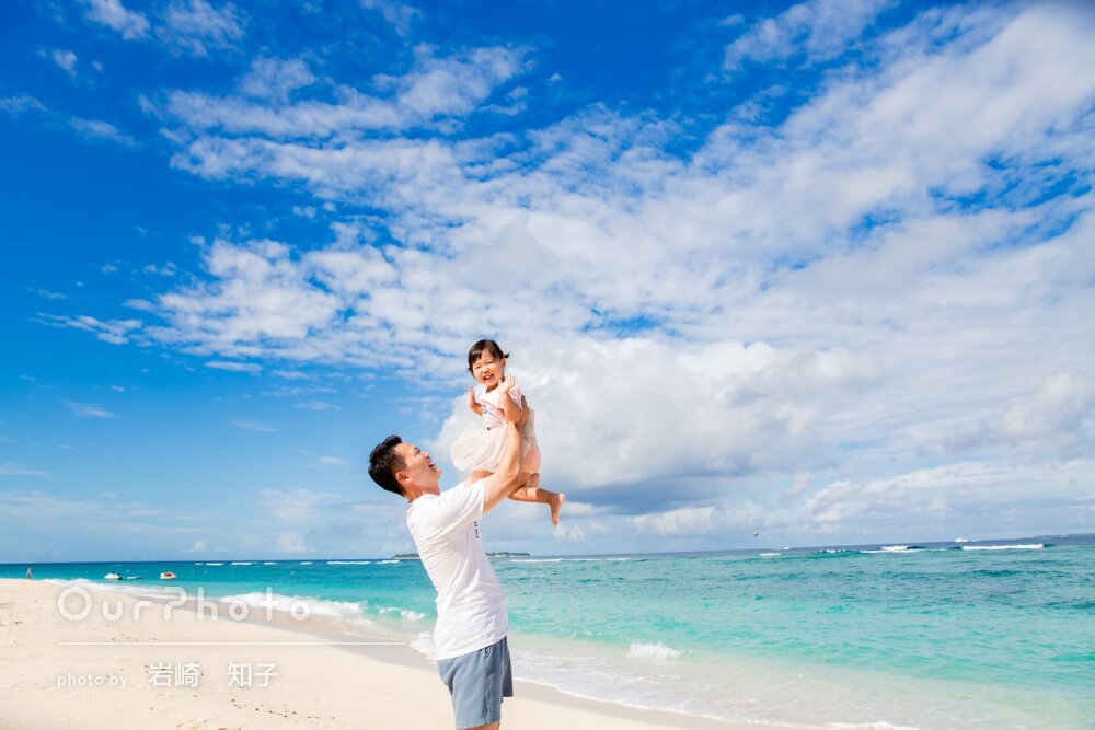 「思い出に残る写真」真っ青な海と空をバックに爽やかな家族写真の撮影