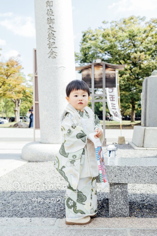 「木々や日差し、建造物等が凄い映えて」笑顔輝く5歳男の子の七五三撮影