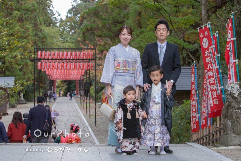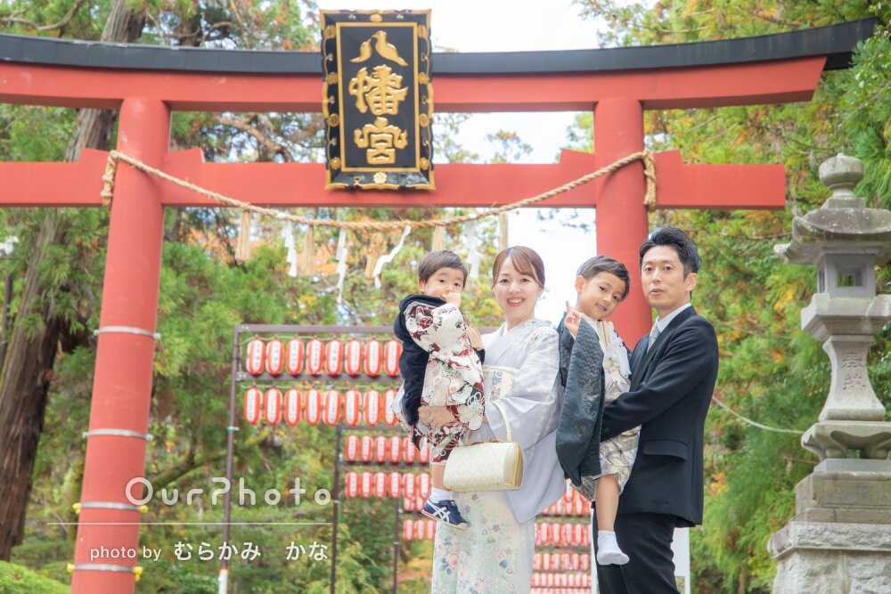 「家族で最高の思い出の日になり」境内の緑に産着が映えるお宮参りの撮影