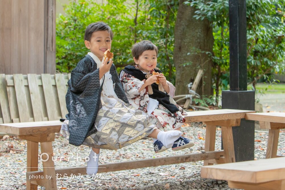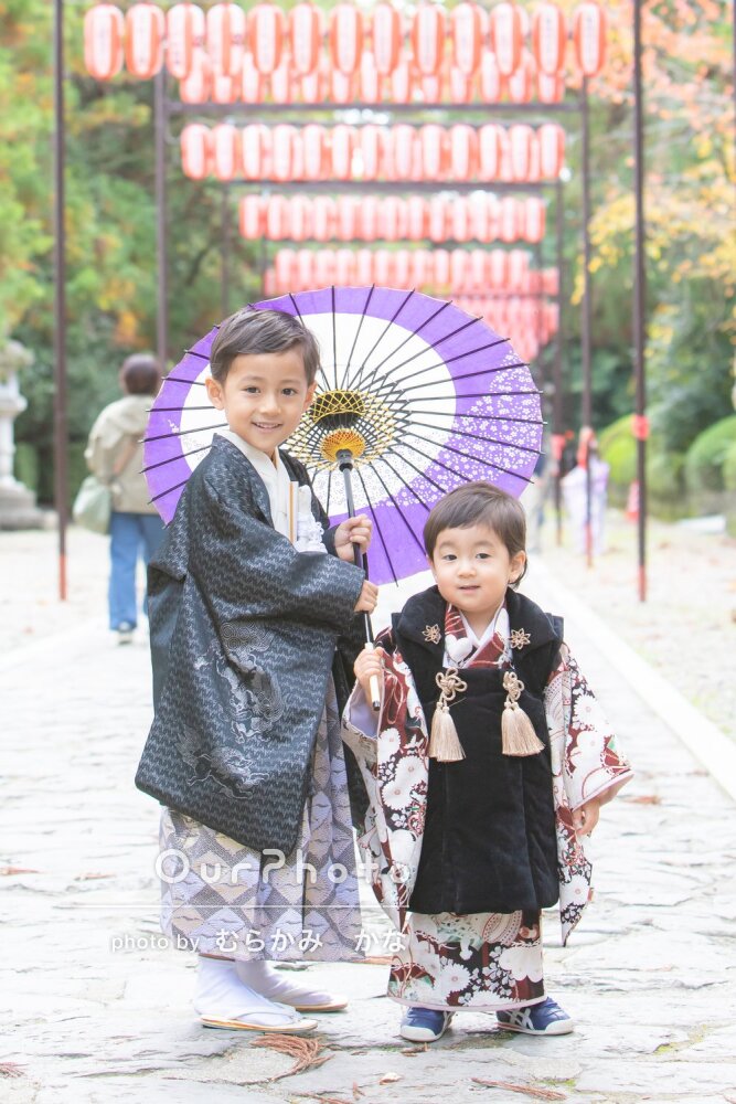 「色々な場所で色んなポーズ」兄弟一緒に和装姿でかっこいい七五三の撮影