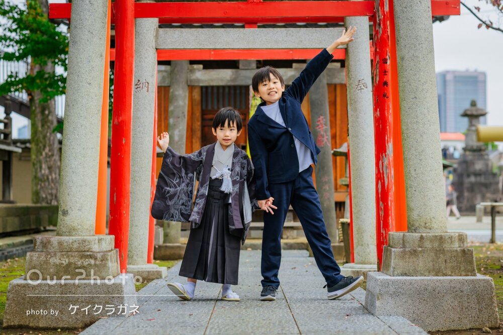 「我が子達らしい楽しい構図の写真」元気いっぱいの七五三写真の撮影