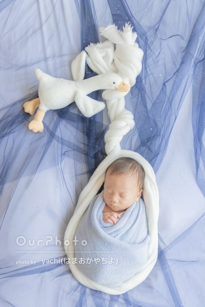 おくるみに巻いたり、小物を使用してポージングしないナチュラルな姿での撮影です。