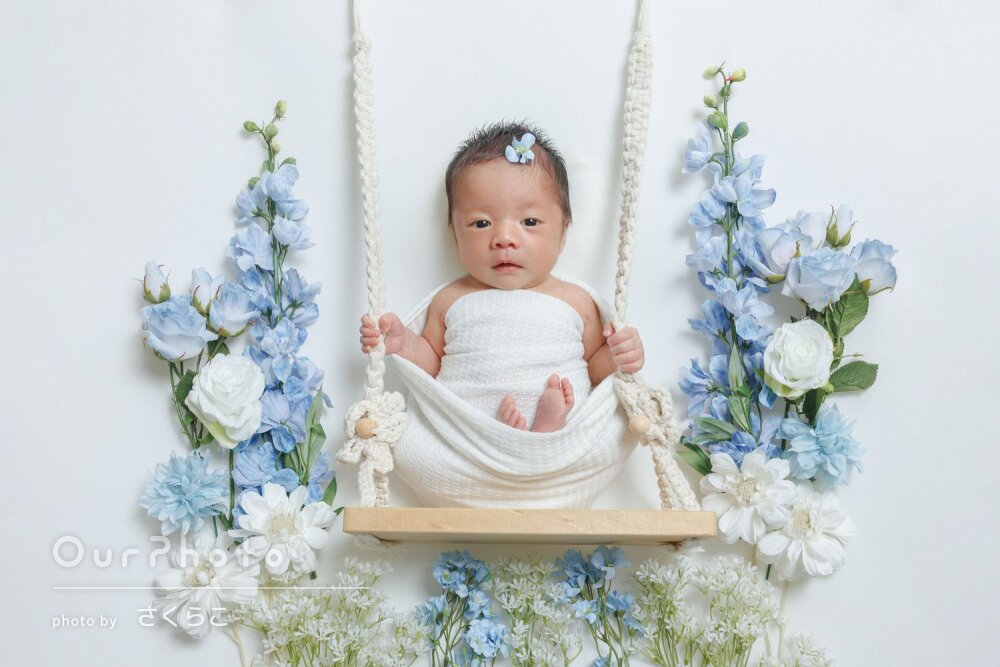 「ブランコの写真が人気」お花や小物でお洒落なニューボーンフォトの撮影