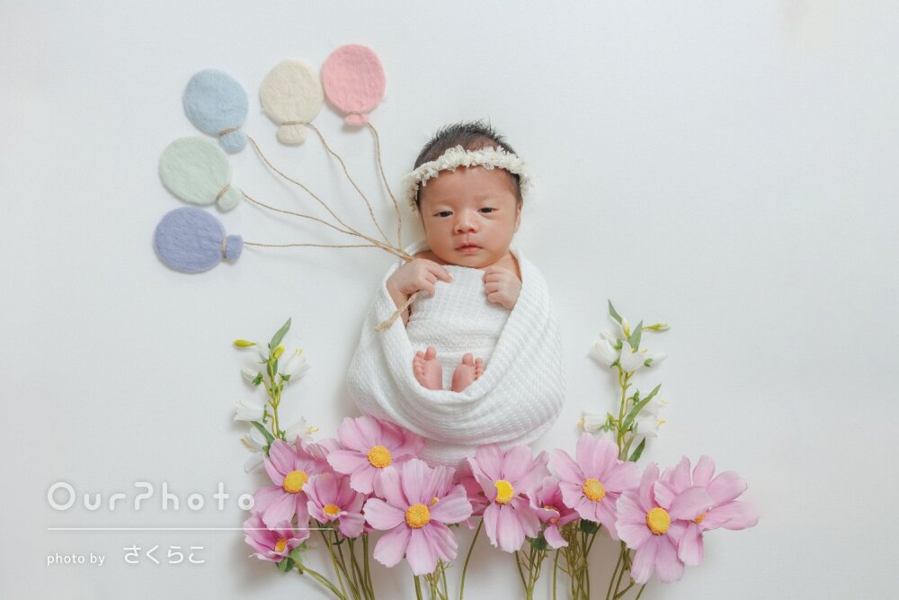 「貴重な新生児期間の写真」花いっぱいで愛らしいニューボーンフォト撮影