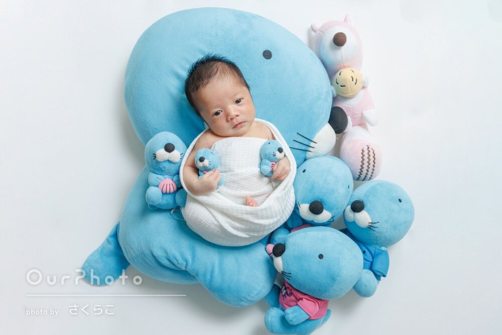 「安心しておまかせ」ぬいぐるみと一緒に可愛いニューボーンフォトの撮影