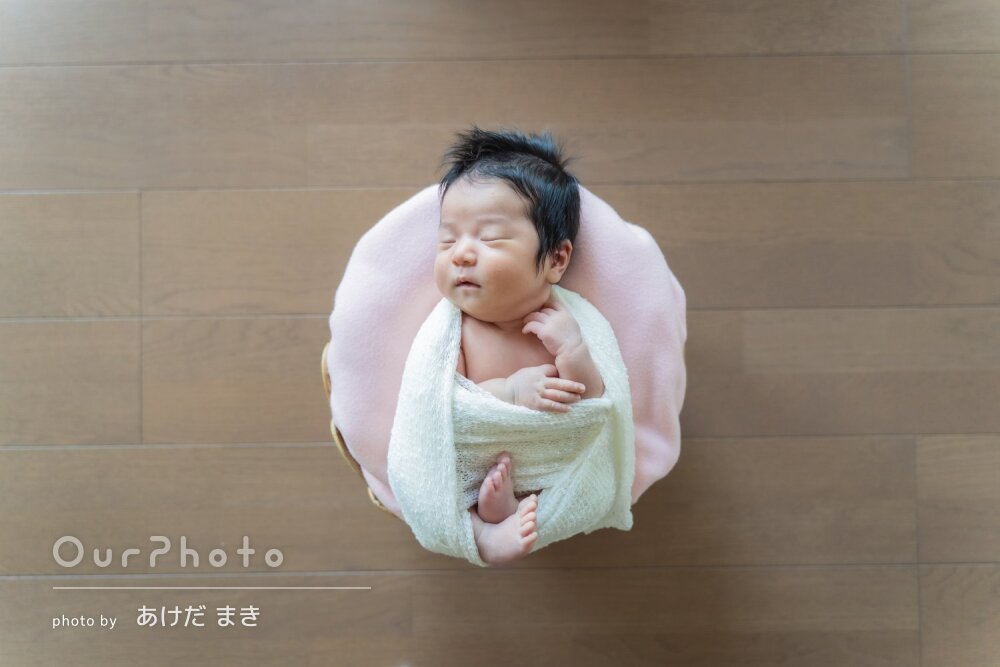 「素敵な写真」愛らしい色合いの小物と自宅でニューボーンフォトの撮影