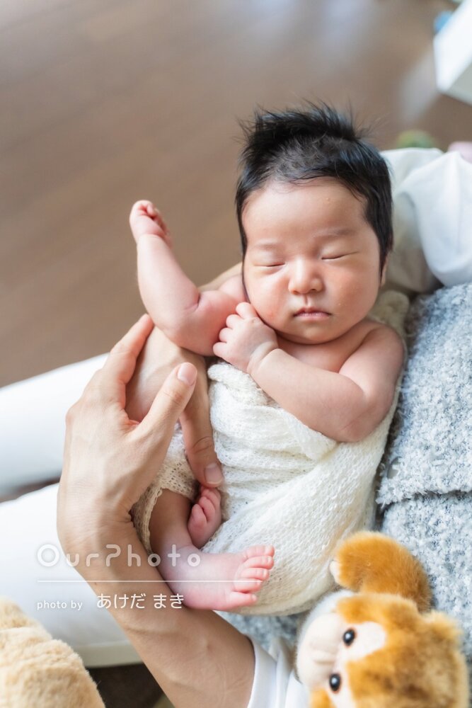 新生児の娘もグズることなく、気持ちよさそうにおくるみに包まれた小さな姿を残していただけました。