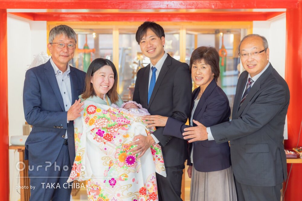 「家族みんな大満足の素敵な写真」祖父母と一緒に神社でお宮参りの撮影
