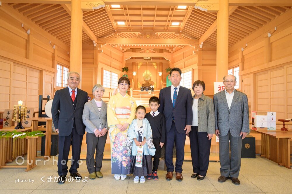 「いろいろなパターンを撮って」神社で祖父母と女の子のお宮参りの撮影