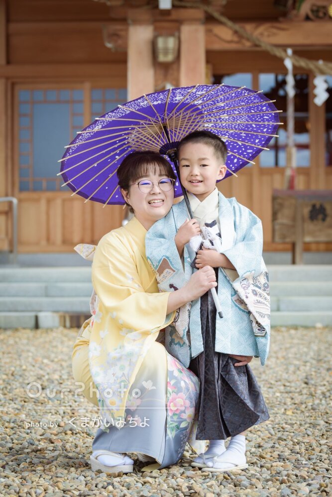 「いい笑顔の写真」リピーター様!和装の5歳男の子の神社で七五三の撮影