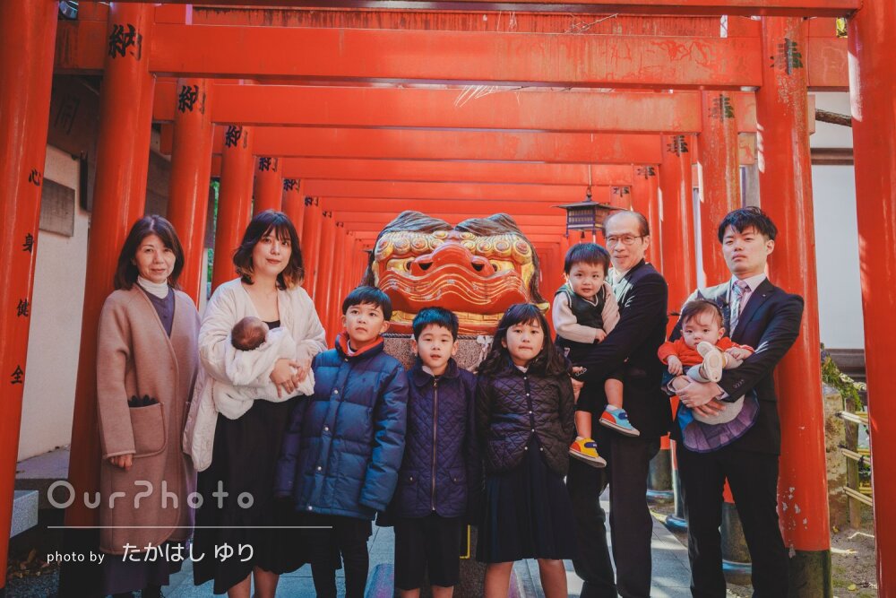 「なかなかみれない全員集合した写真」大家族の和やかなお宮参りの撮影