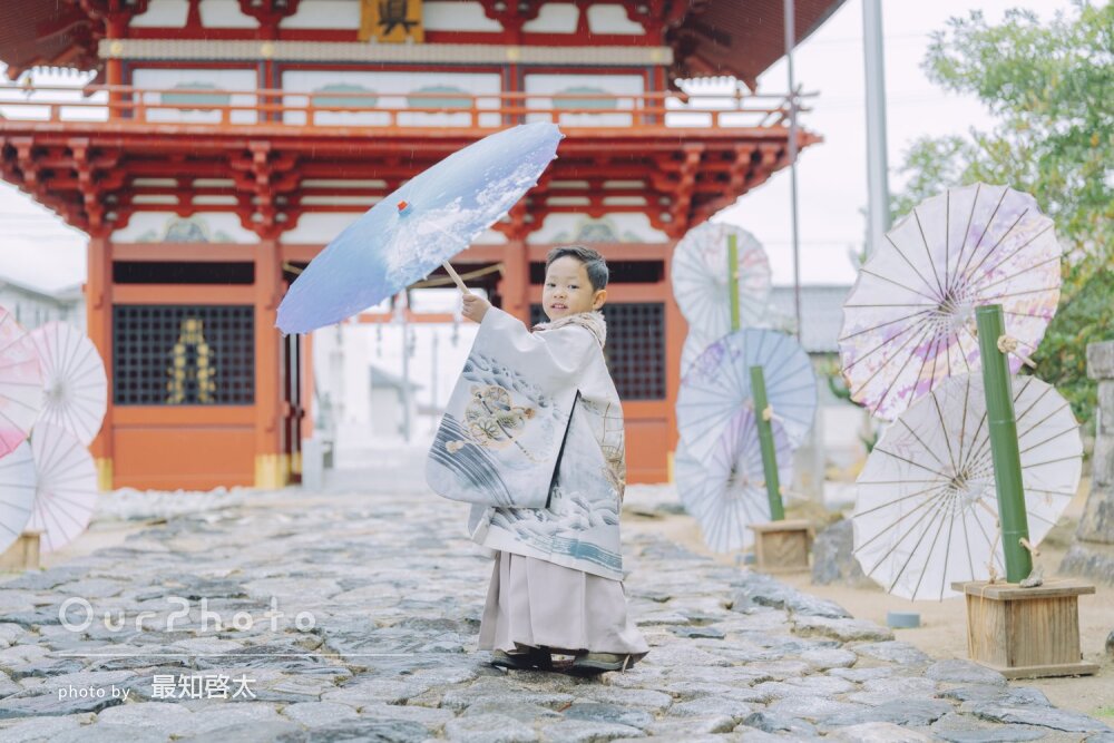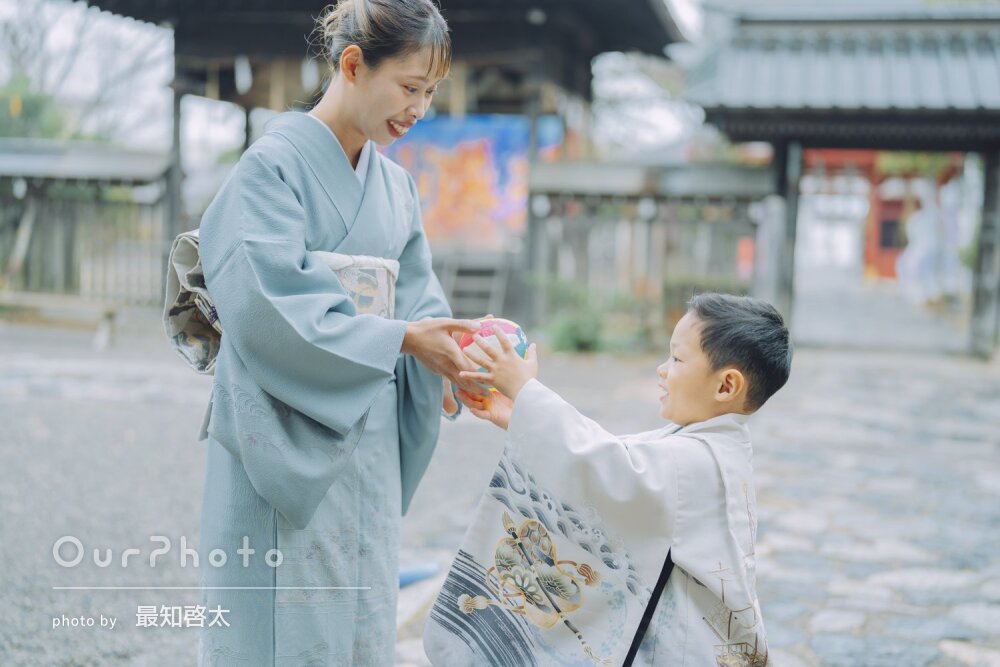 「自然体な写真をたくさん撮って」神社で和装の男の子の七五三の撮影