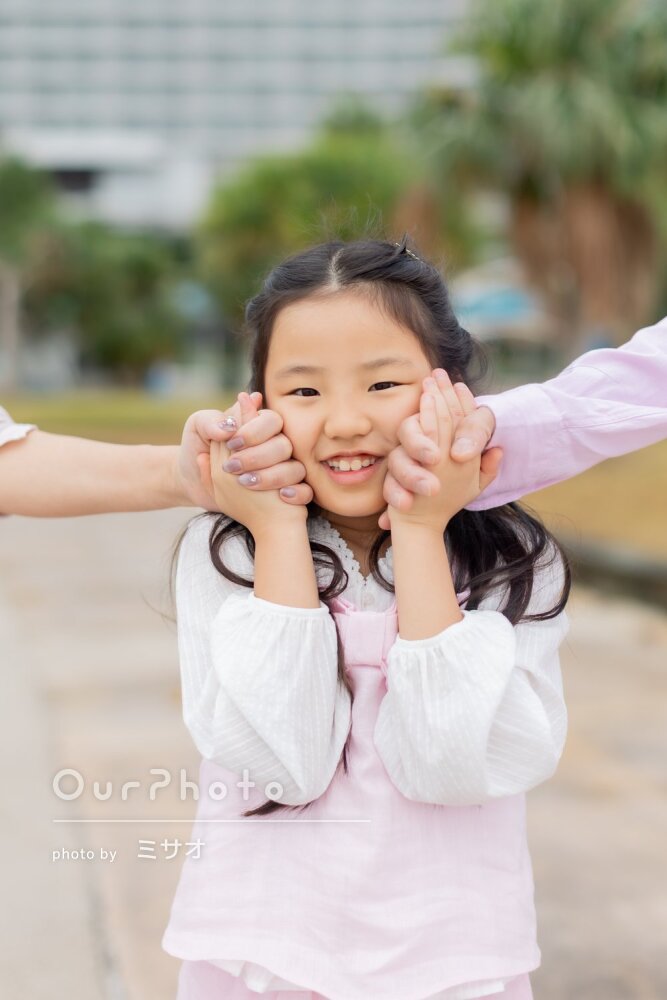 「リラックスして」沖縄の青い海で笑顔がキラキラ輝く!家族写真の撮影