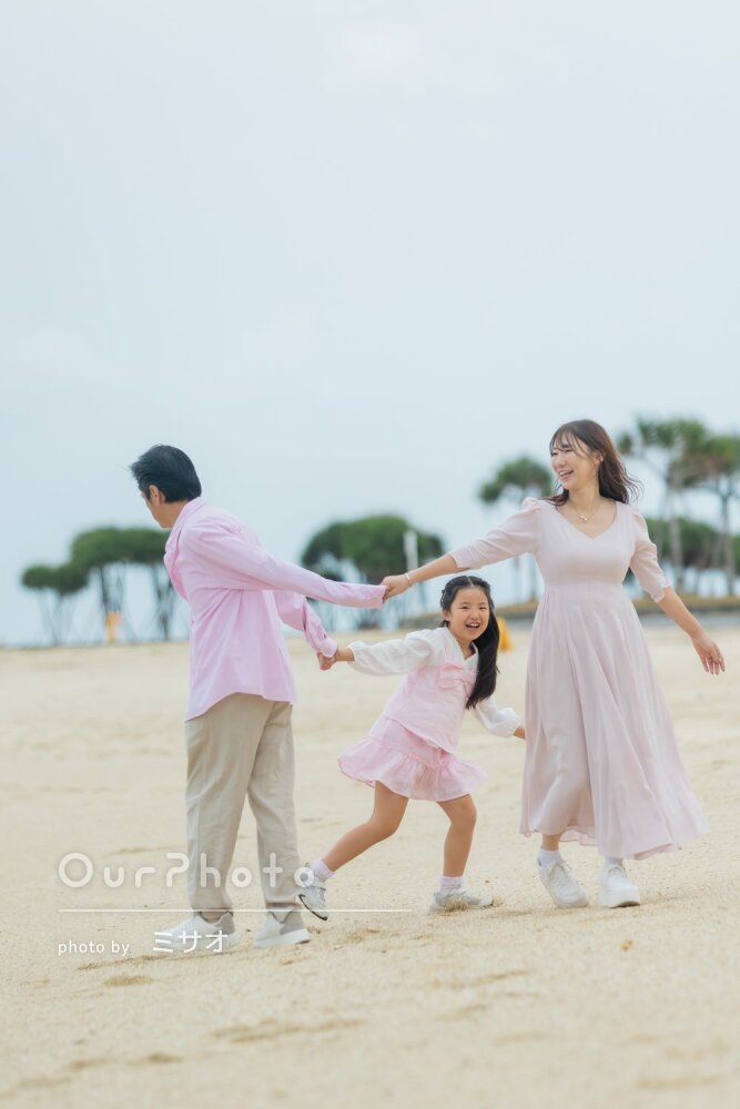「素敵な写真」沖縄の透き通った海辺で笑顔溢れる家族旅行フォトの撮影