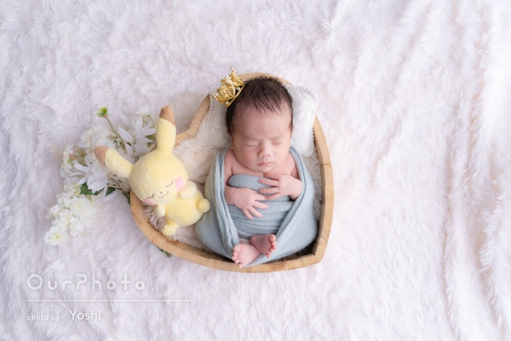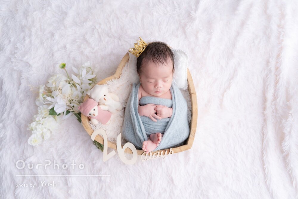 ベッドやカゴに入ったお包みセットを3パターン+ご希望撮影2パターン。