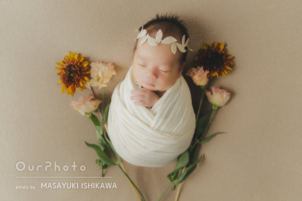 ニューボーンフォトをとるにあたり、色々なサイトを見る中で、ミラさんが本物の花を使用しているのを知り、依頼しました。お花を利用してすごく可愛く撮っていただき、また撮影中の会話もあり、すごく良い雰囲気で撮影が行えました。赤ちゃんなので、寝なかったり、排泄したりと色々と撮影中ありましたが、終始笑って撮影いただき、とても楽しかったです。