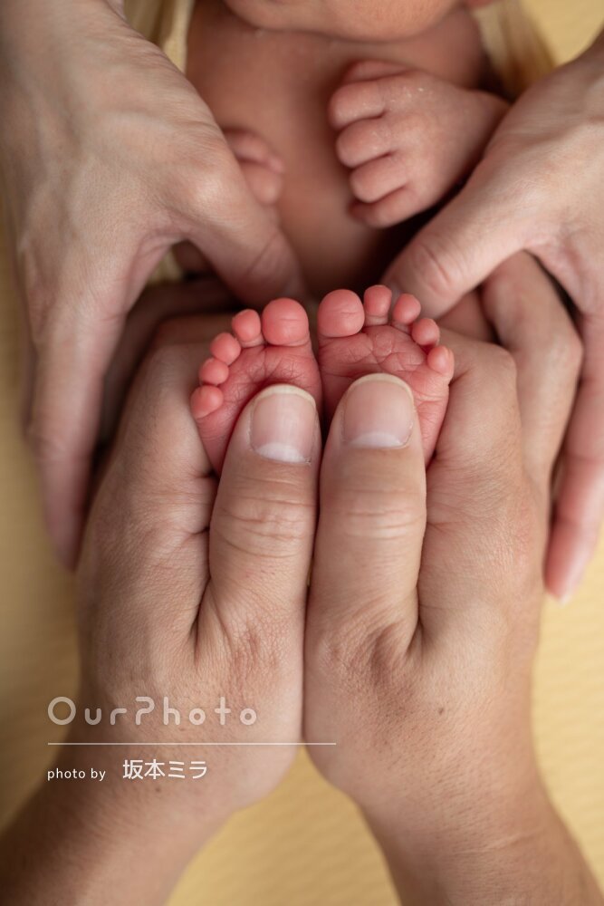 ニューボーンフォトは初めての経験で、最後の出産になるので撮っておきたいと思っていました。こちらで探したところミラさんのお写真を拝見して絶対お願いしたい!と思い、産後の入院中にお願いしました。急遽の日程変更も応じて下さり、なかなか体調がよくならなかった中、出張で自宅まで来て頂き本当に助かりました(^^)