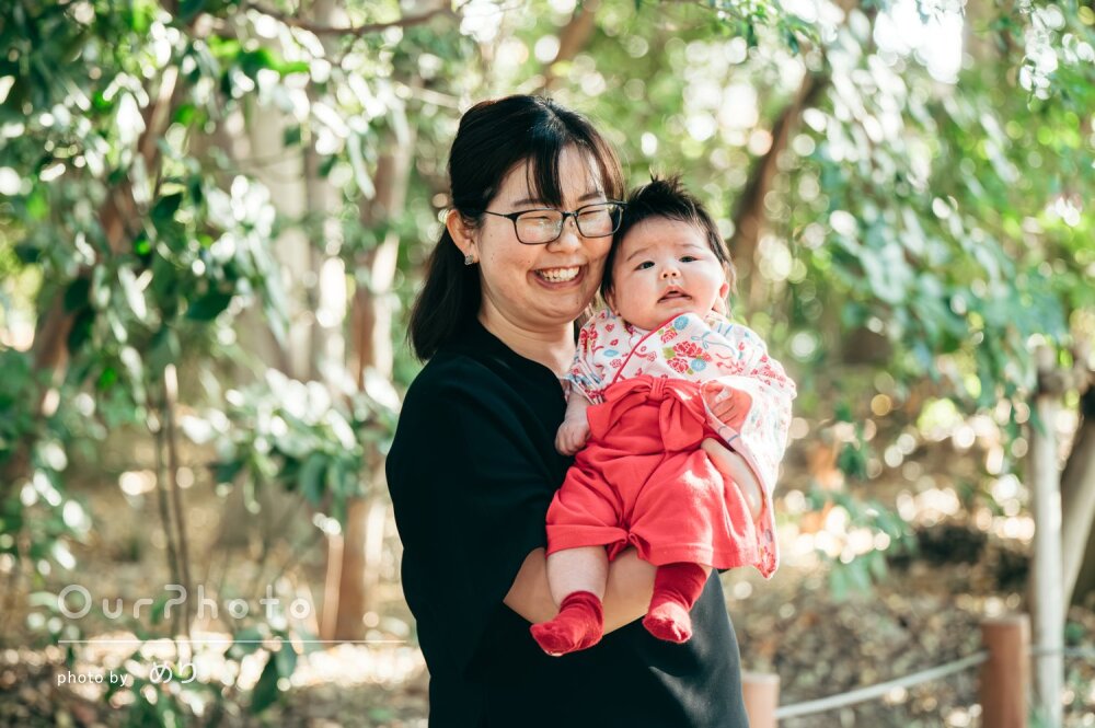 事前に、自然体の写真をたくさん撮ってほしいことをお伝えしておいたところ、当日は色々なエリアで指示を出してくださり、素敵な写真をたくさん撮って頂きました。お宮参の撮影だったのですが、両親交替で息子を抱っこしたところを撮っていただき、思い出になりました。息子のことも可愛がってもらい、子ども好きなことや優しい雰囲気にが伝わってきました。