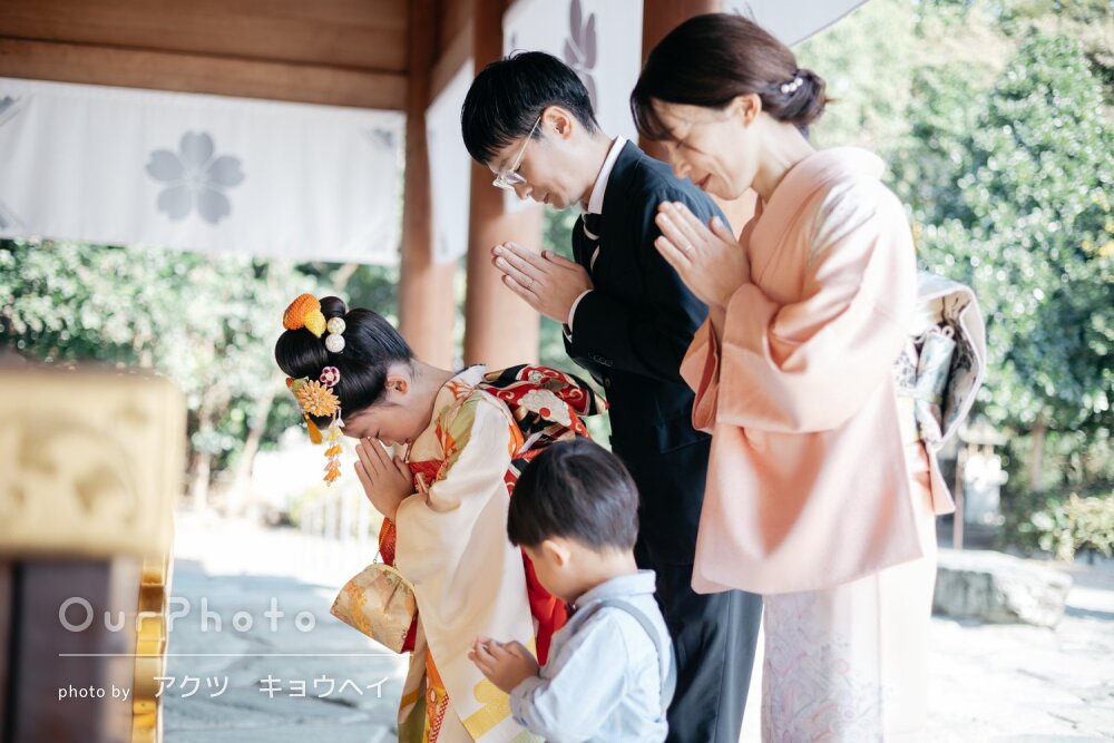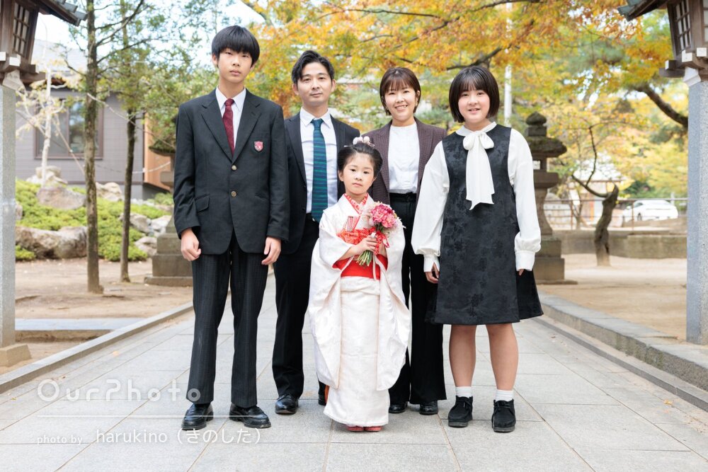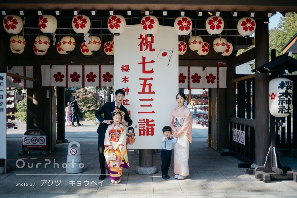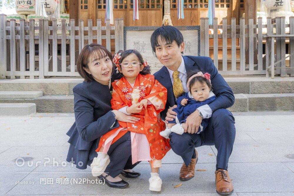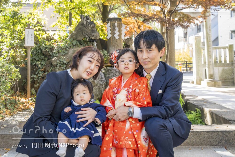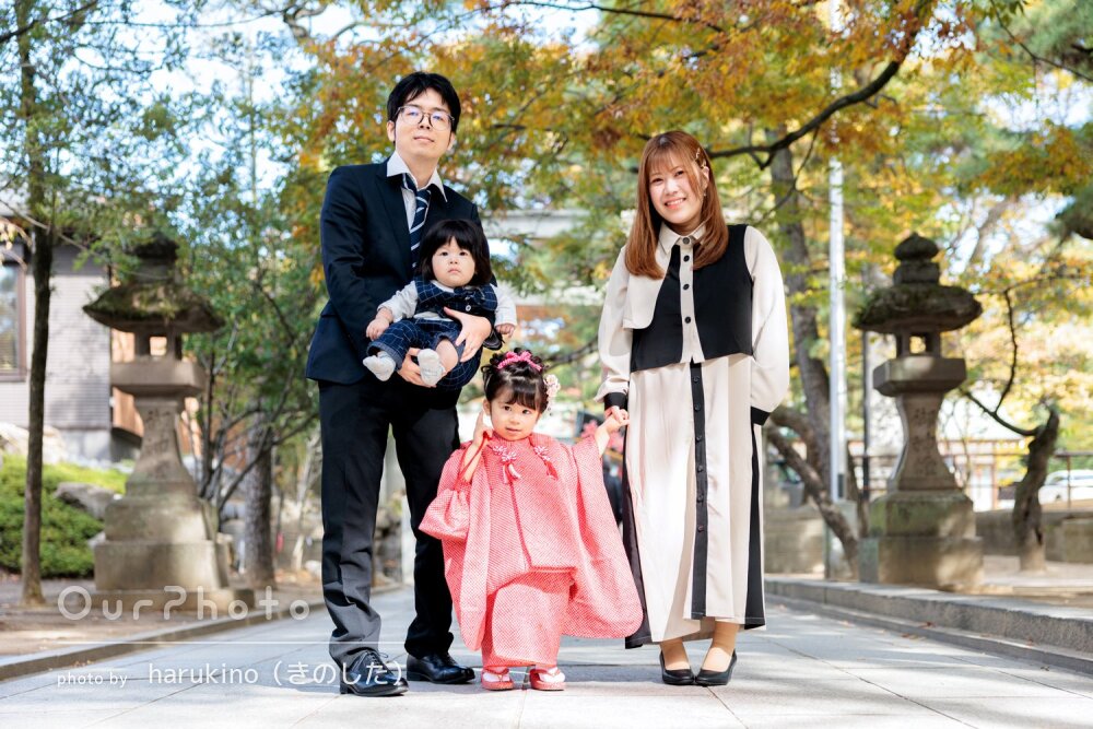 七五三シーズンで、平日でしたが神社にも他の参拝の方々がいましたが、空いているエリアからの撮影をご提案いただいたり、持参いただいた道具を貸していただき、とてもスムーズで楽しい撮影となりました。家族全員、思い出に残るお写真となりました☻また機会がございましたら、是非お願いしたいです。本当にありがとうございました!