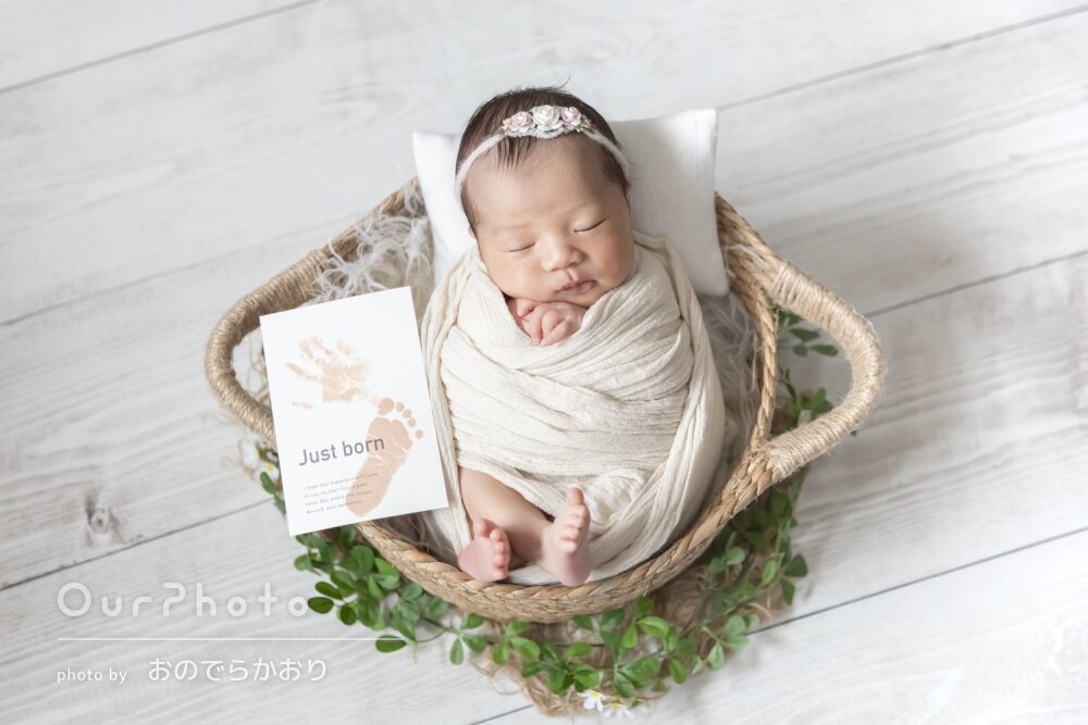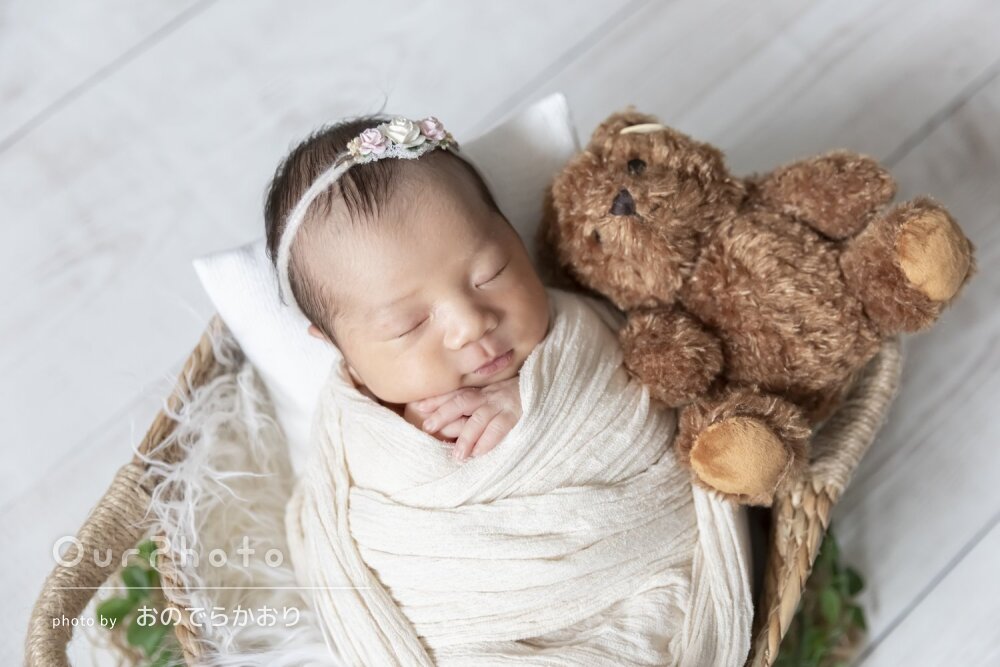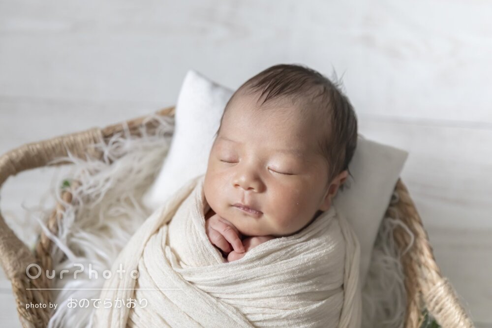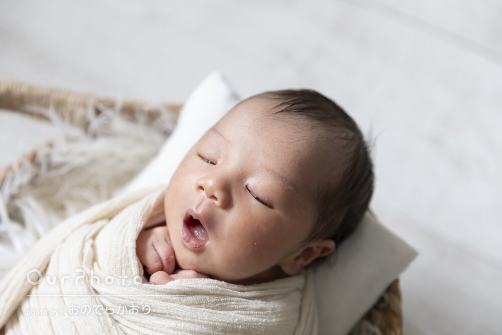 また当日もとても素敵なお人柄に何度も助けられました。当日は私たち両親のバタバタが赤ちゃんに伝わってしまったせいかなかなか寝ついてくれず困っていた際にも、寝てくれるアドバイスや音楽、最終的にはスピーディーに寝かしつけまでご協力頂き感謝しております。カメラマンのおのでら様もお二人のお子様もいらっしゃるとのことで、安心して全てをお任せできました。アクセサリーやおくるみのカラーも豊富で選ぶのに困ってしまうほどの種類がありました。わざわざお家まで持って来ていただきありがとうございます。また、撮影しているところのお写真や動画も撮らせていただき、データが届くまでにも思い出として振り返ることができ嬉しかったです。