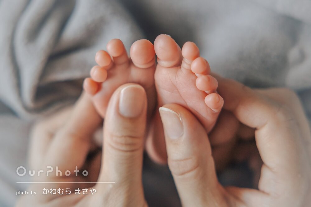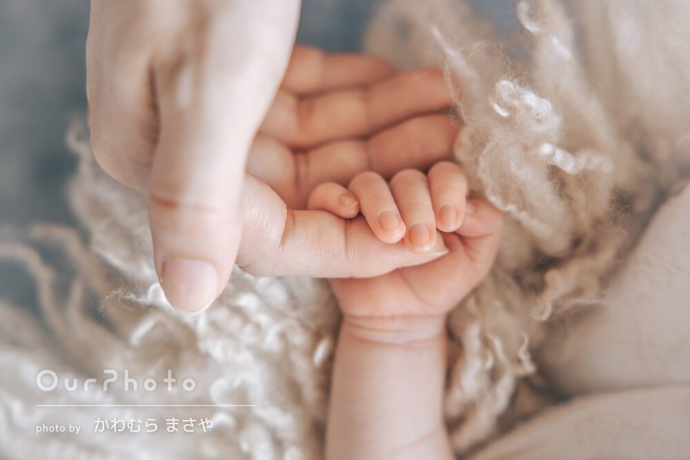 赤ちゃんが生後3週間を過ぎていたこともあり、あまり寝てくれなかったのですが、授乳やあやす時間をとってくださり、たくさんのシーンを撮影いただきました。また、パパママは手のみ撮影と考えていましたが、家族写真を撮ることを提案してくださり、ママは写真撮影をお任せして身支度の時間をとらせてもらい、3人での写真も残すことができました。