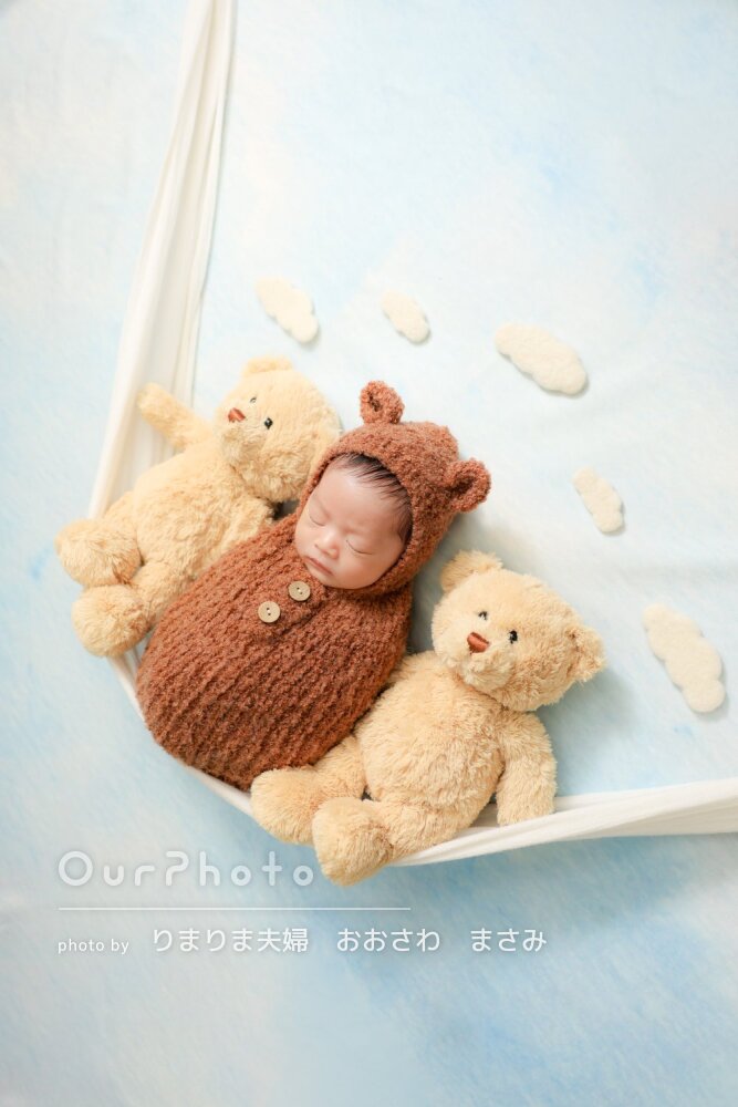 1歳の兄と一緒に撮影をお願いしました。2人ともまだ小さいのでしっかり撮影できるか心配でしたが、下の子はおくるみに巻かれるとすぐにぐっすり、上の子もあやしてもらってにこにこで参加できました。素敵な写真を撮ってもらい大満足です。