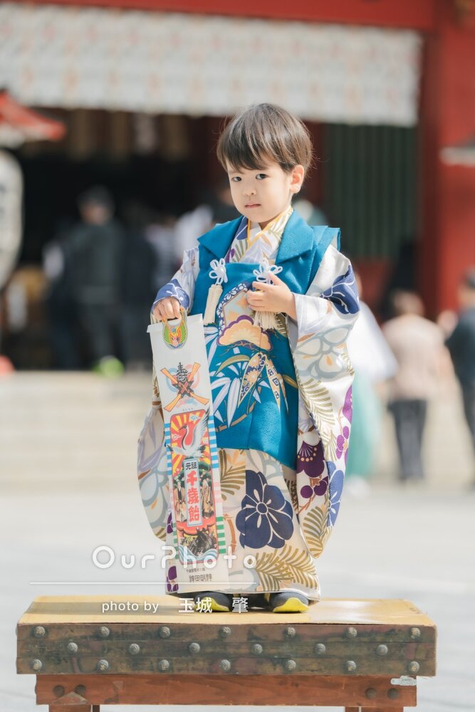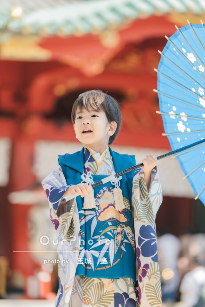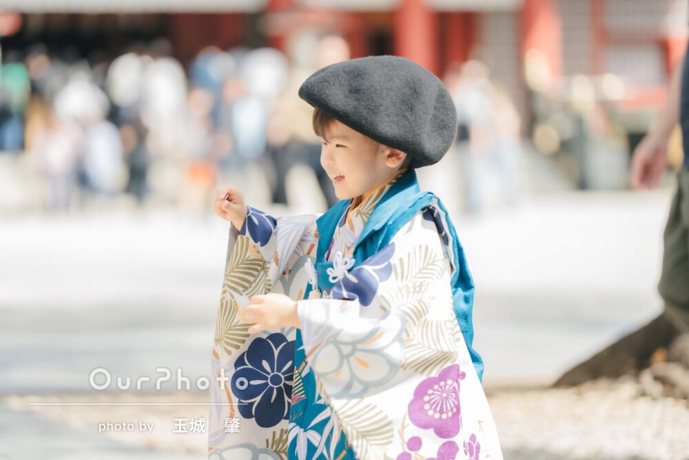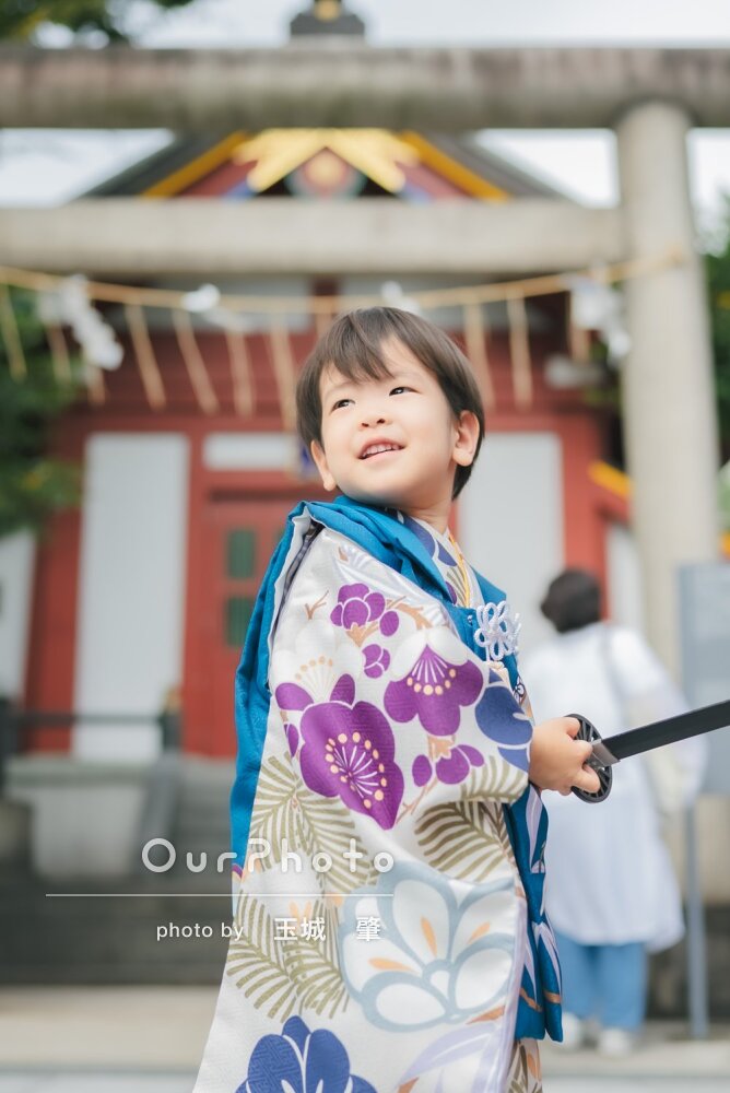 当日は、着物がきつくてご機嫌斜めな状態で神社に到着したのですが、到着後すぐにみーさんと会い、みーさんの声掛けで途端に元気にポーズを取り出しました。いろいろな小道具を使ってもらったり、終始ポジティブな声掛けで子供の気持ちをつかんでくださいました。
