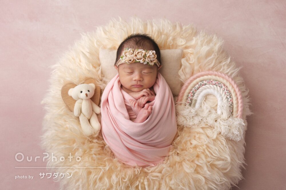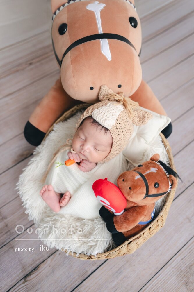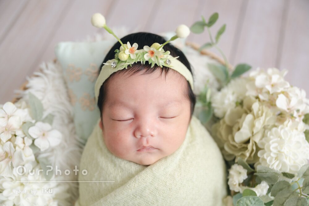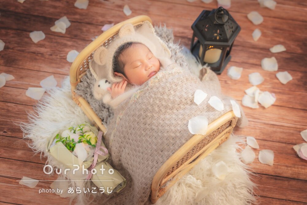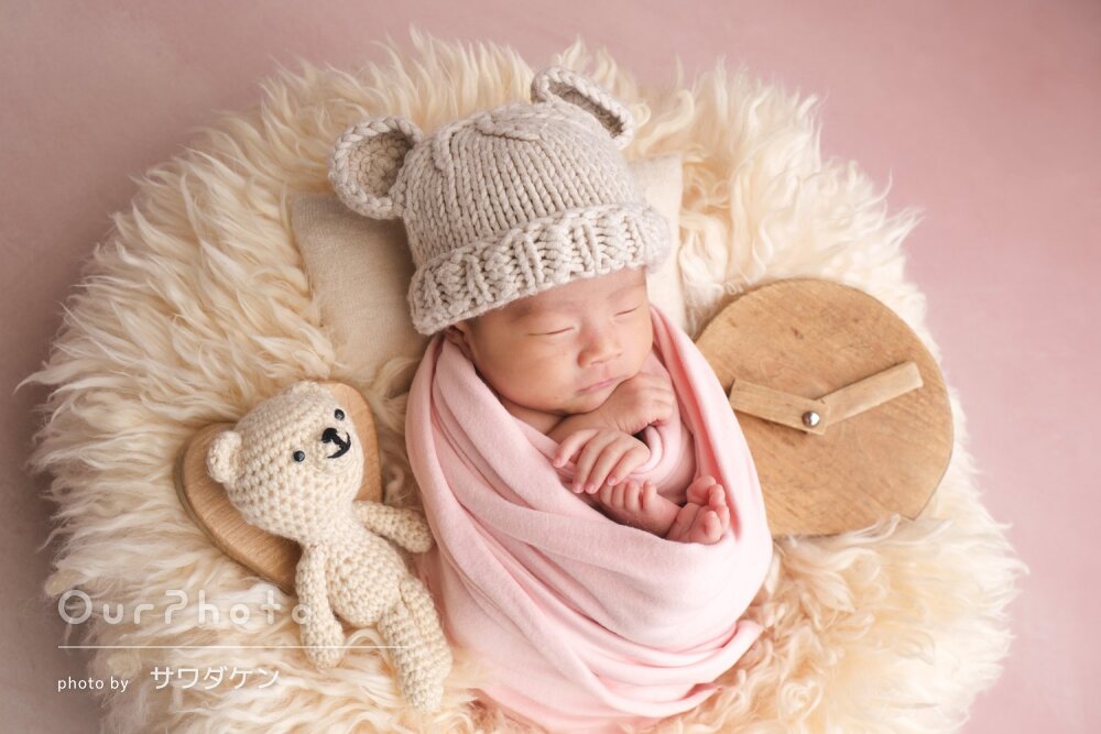 当日赤ちゃんがなかなか深い眠りにつけず時間制限もある中大変だったかと思いますが、可愛い小物を使ったいろんなパターンの可愛い写真を撮っていただきました。ありがとうございました。