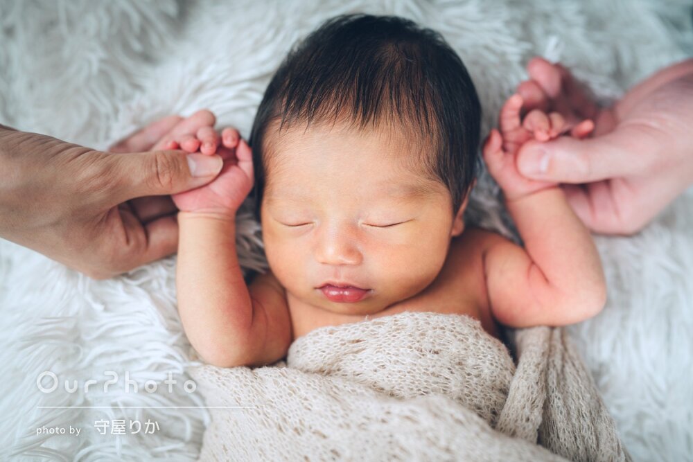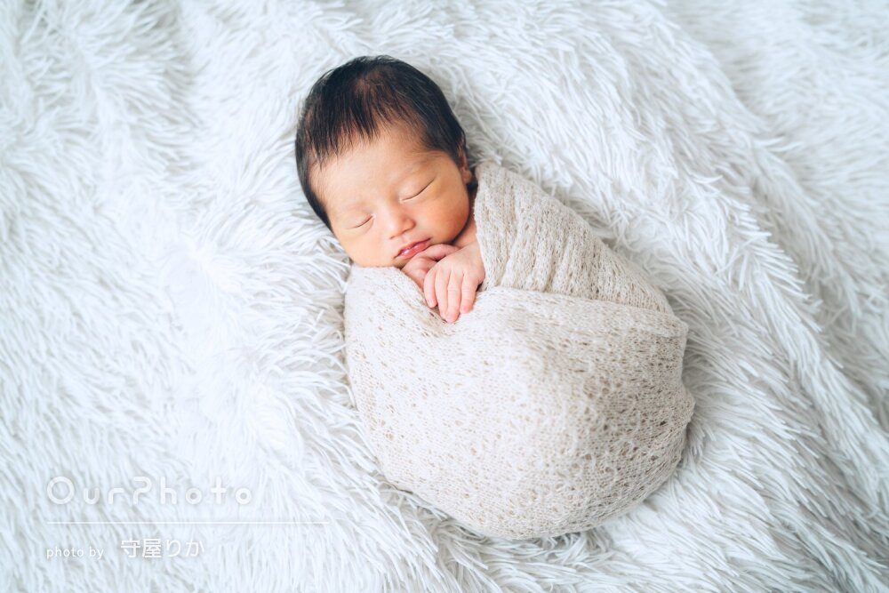 おくるみ撮影を希望していましたが、わが子はおくるみが苦手で少し不安もありました。ですが、しらたま様の優しい手つきと心地よいおくるみで、すぐにスヤスヤと眠りにつき、驚くほど穏やかな表情を見せてくれました。