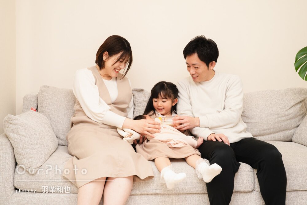 先日は素敵な写真を撮影いただきましてありがとうございました。家族4人での初めての家族写真、とても嬉しいです。記念になりました!