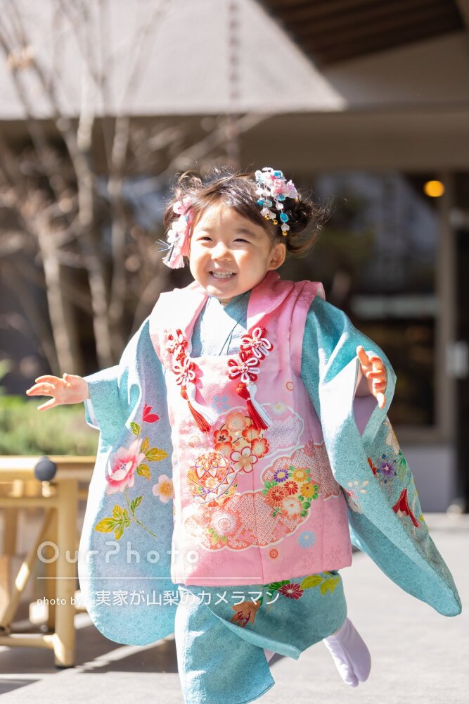 人見知りな娘ですが、優しく接してくれるカメラマンのお姉さんにすぐ心を開いてくれました。これまでお食い始めや1才の誕生日はフォトスタジオで撮影しており、泣いた写真しかありませんでした。しかし七五三は、いつもの笑顔をたくさん撮っていただき本当に感謝しています。当日は下駄を脱いで走り回ってばかりでしたが、お姉さんが次々と小道具を出して下さり興味津々!さよならした後に娘がまたお姉さんに会いたいと言うほど大好きになっていました。毎年家族写真をお願いしたいなと思っています。