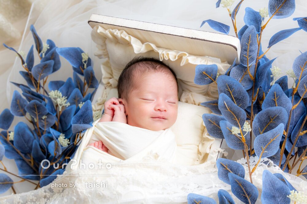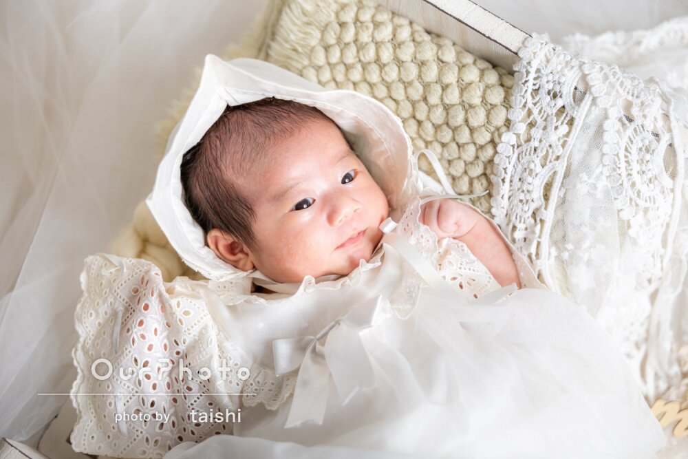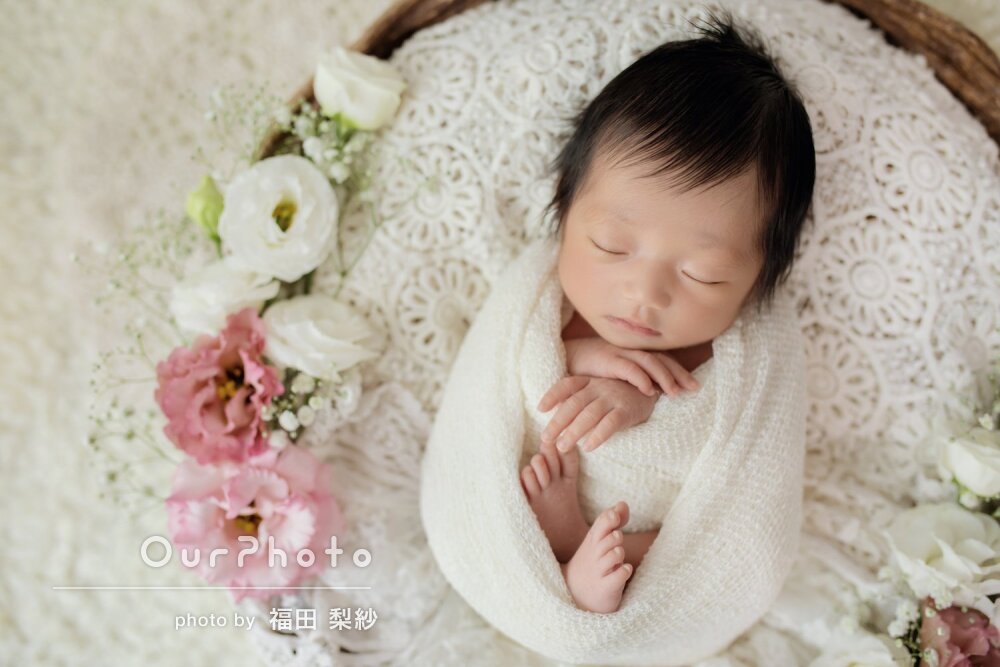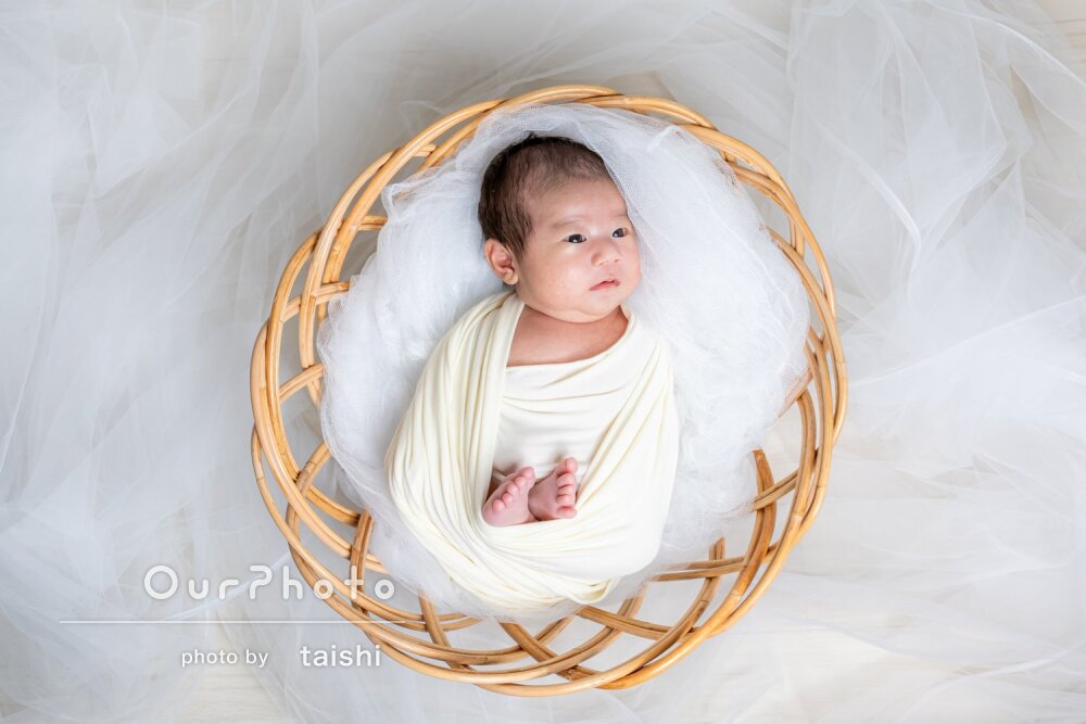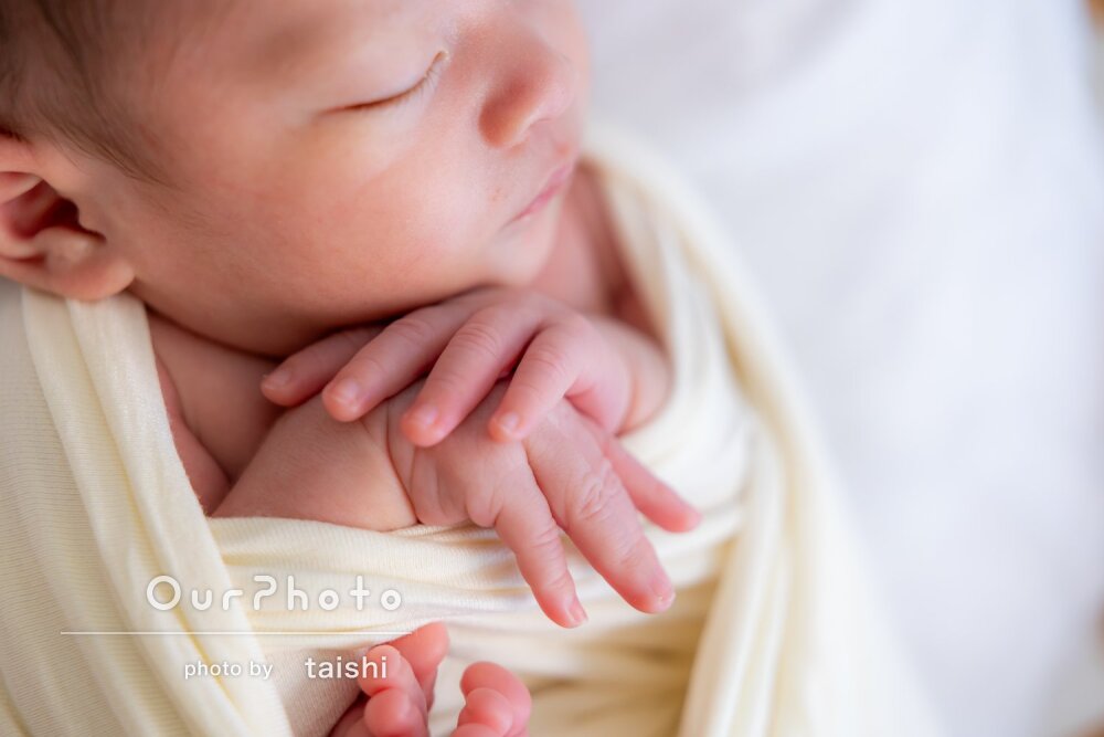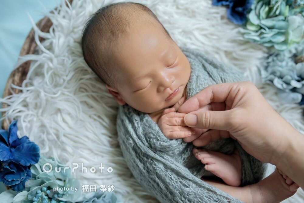こういった自宅での撮影が初めてで勝手が分からず心配していましたが、事前のやりとりでも質問に丁寧にお答えいただき、小物の準備やおくるみを巻くのも当日手際よくやっていただき安心しました。