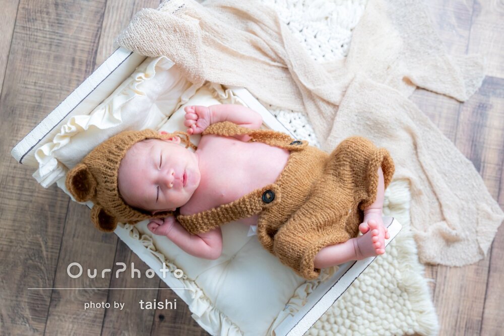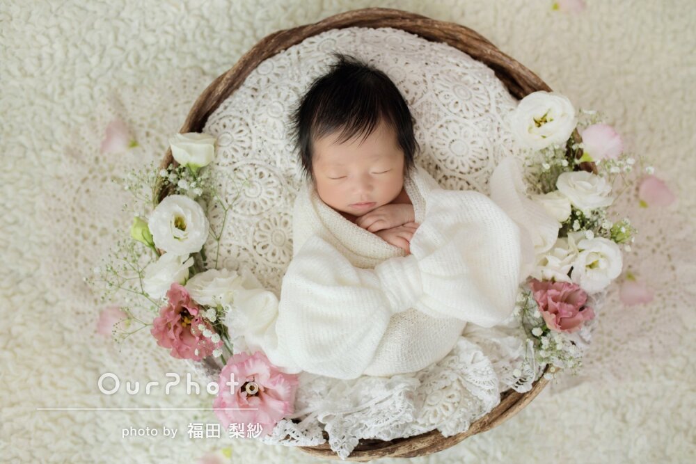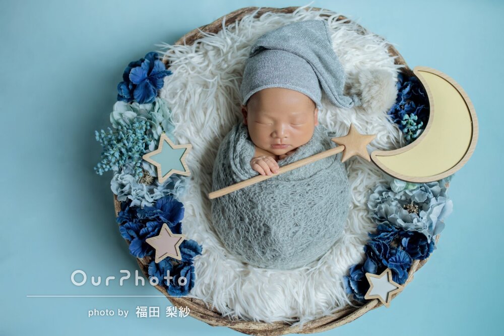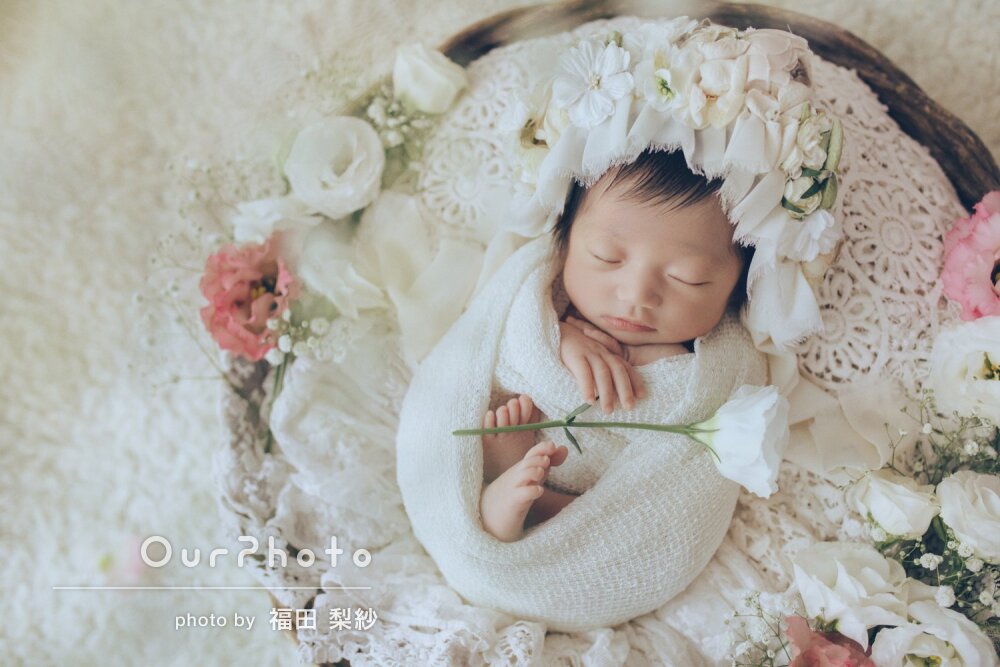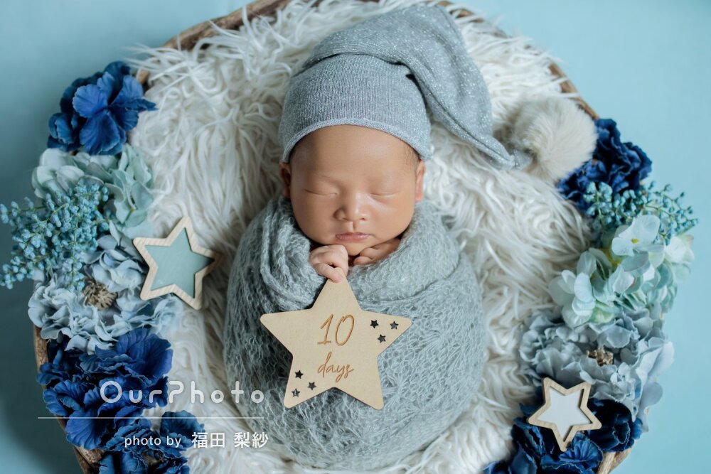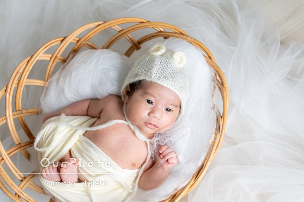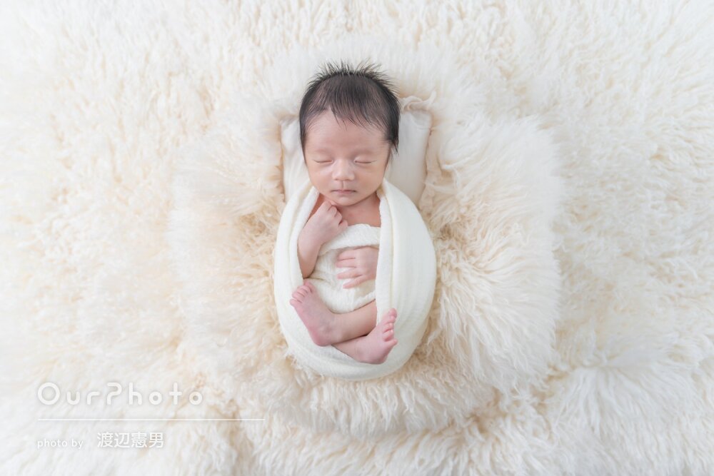 こういった自宅での撮影が初めてで勝手が分からず心配していましたが、事前のやりとりでも質問に丁寧にお答えいただき、小物の準備やおくるみを巻くのも当日手際よくやっていただき安心しました。