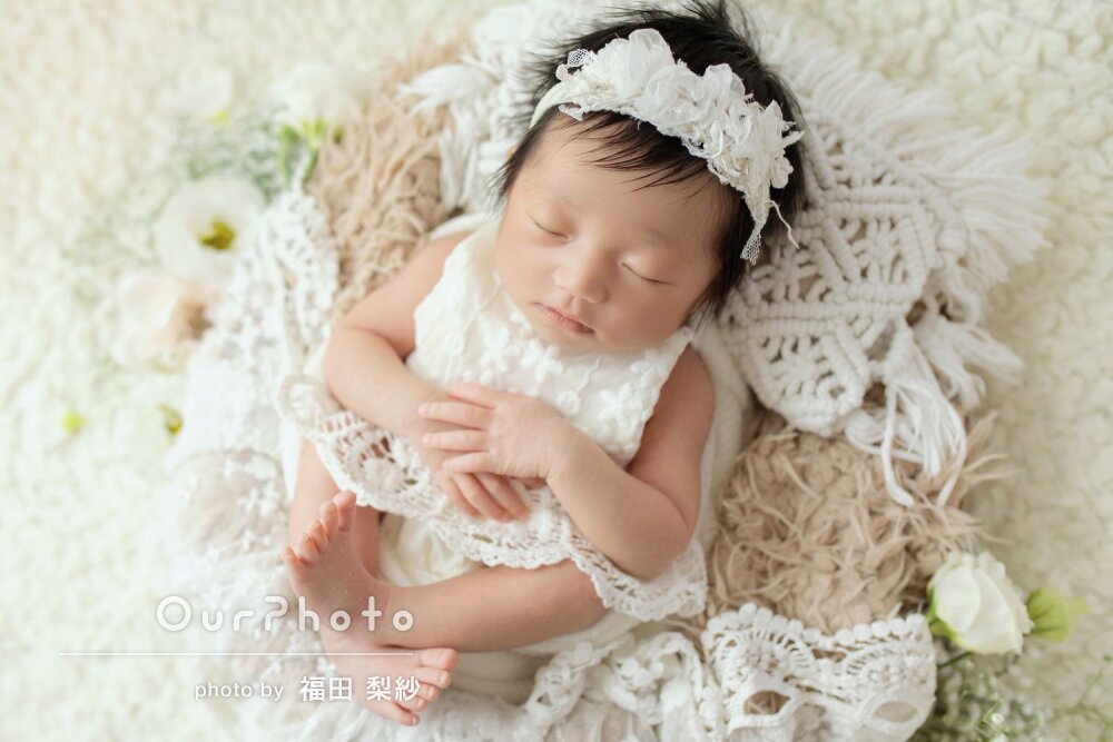 楽しみにしていたニューボンフォト撮影は、準備からお着替え、撮影もスムーズでどれも可愛すぎて決められなかった髪飾りもいくつか付けてくださいました。娘も起きることなくリラックスして撮影出来たと思います。
