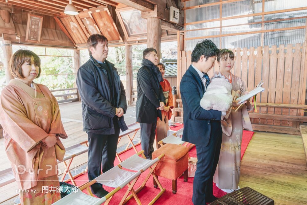息子はじっとしていられない方なのですが、上手に声掛けをしていただいたので、ノリノリでポーズをとってくれました。傘の小道具も持参してくださり、素敵な写真を何枚も撮って頂きました。祈祷の最中の写真は、自分たちでは撮ることはできなかったと思うので、撮っていただけて良かったなぁと思いました。途中、息子が決められずお待たせしてしまいましたが、嫌な顔ひとつせず待ってくださりました。本当にありがとうございました。撮影後息子も、もう写真のお兄さんはいないの?と言うほど、息子に寄り添ってくださいました。