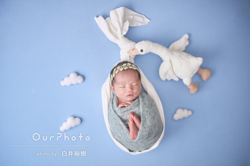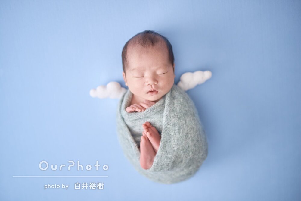 事前のやり取りもスムーズで、撮影の手際もよく、おくるみにくるんだりポージングさせたり、赤ちゃんの扱いもとても安心できました。絶対に自分では無理でした。