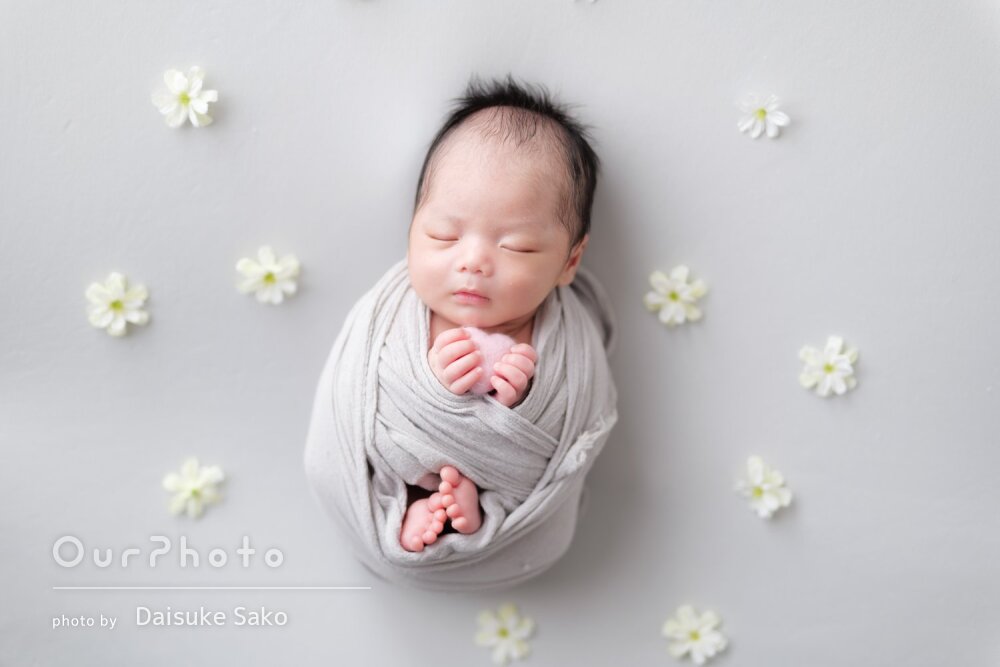 スムーズに撮影準備していただき、衛生面にも配慮いただきながらおくるみも丁寧に巻いていただけて安心して撮影をお願いできました。