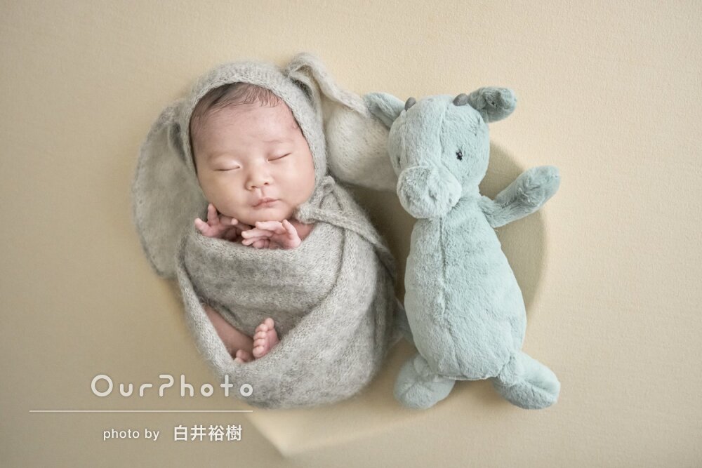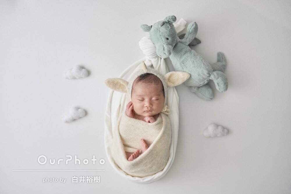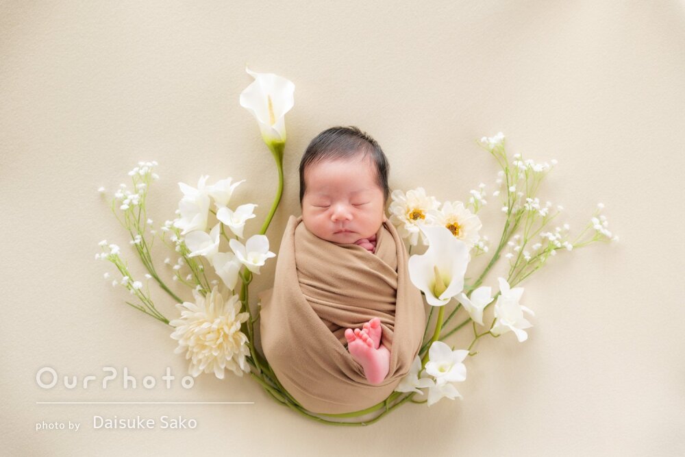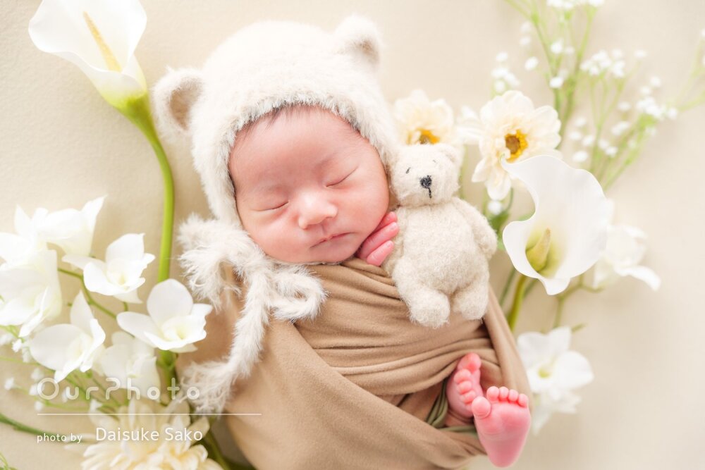 当日は2枠で予約したため撮影に2時間近くかかりましたがとても手際が良く、多少ぐずっても上手にあやして下さったおかげで終始寝てくれて感動したのと、赤ちゃんをとても丁寧に扱って下さるので安心して撮影を見守ることができました。