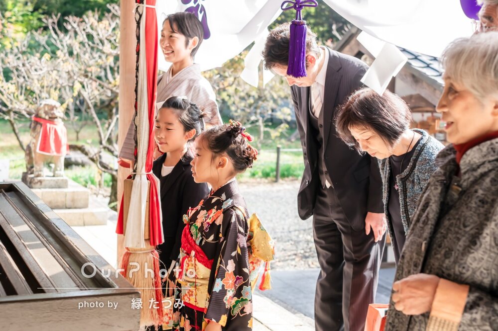 七五三の撮影でお世話になりました。3歳2ヶ月の男の子で、じっとしている時間が無く、常に動いている子供の一瞬一瞬を撮影していただき、出来上がった写真を見ていくと「こんな姿はプロでないとまず残せなかったな」とか、柄杓を持った手のアップ写真も「こんな小さな手は今だけだな」と思わせられるショットがあり、じーんと感動しました。カメラ目線が欲しい時には、アシスタントの方がとても上手に子供を惹きつけてくださり、某局の子供向け番組のお姉さん顔負けの子供への接し方で、親まで自然な笑顔が溢れました。子供はお会いして直ぐに、気さくなおおはたさんとお姉さんを好きになったようで、一緒に遊んでいただきながら、途中途中で撮っていただいた最高の一瞬を写真にしていただき、本当に感謝です!また5歳の七五三もどうぞよろしくお願いいたします!