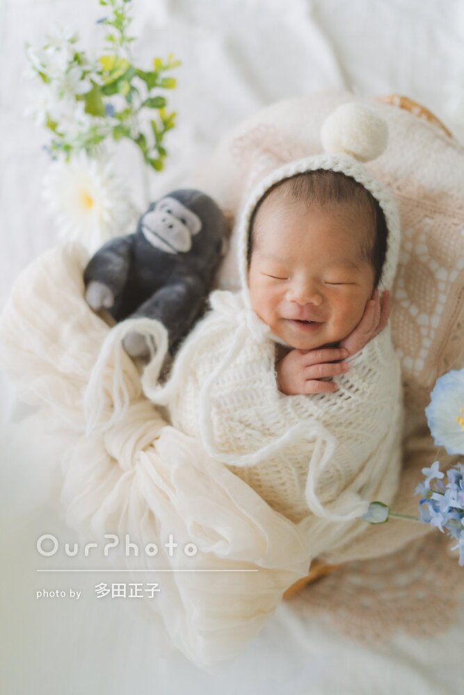 ニューボーンフォトをお願いさせていただきました。撮影が始まってすぐに赤ちゃんが泣き始めてしまい時間を超過してしまい大変申し訳なかったのですが、基本セット撮影を完遂してくださり、そして出来栄えもとっても素敵で感動しました!小道具も全てハイセンスで、モデルのような仕上がりになりました☺️また機会があればお願いさせていただきたいです!この度は本当にありがとうございました!