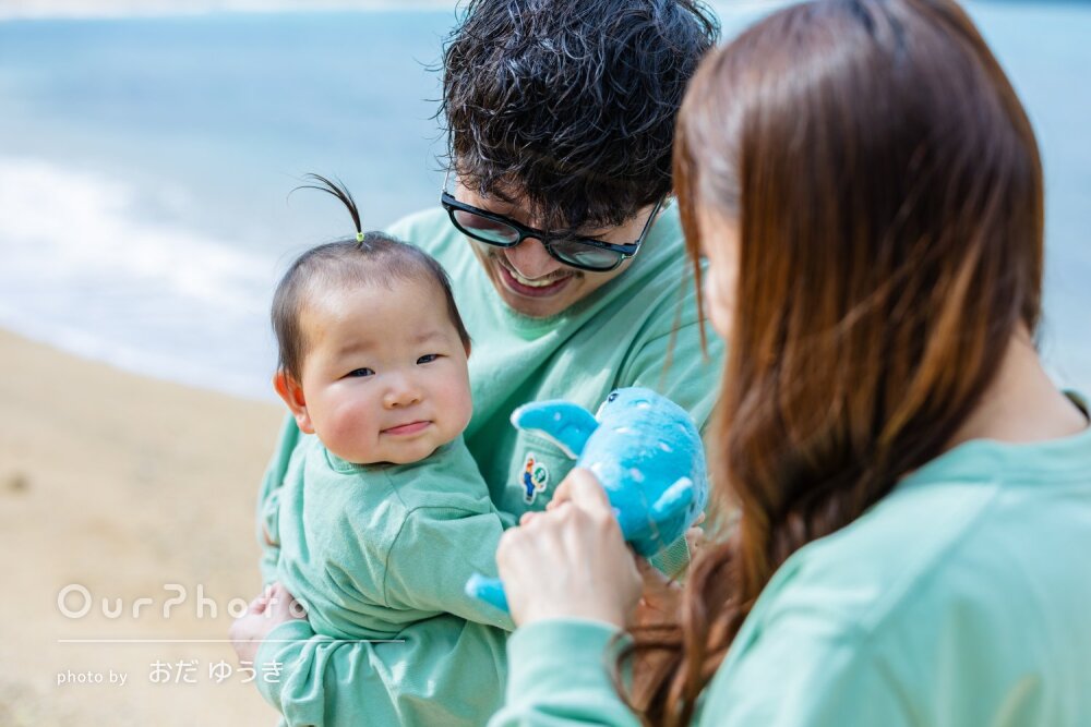 息子が人見知り期だったので心配していましたが、ミサオさんのお人柄もよく、鈴やぬいぐるみも持参していただき、途中からニコニコで砂浜で遊んでいました。おかげさまで、素敵な家族写真を撮っていただきました。リクエスト通りの自然体の写真の仕上がりに大満足です。至れり尽くせり、本当にありがとうございました。