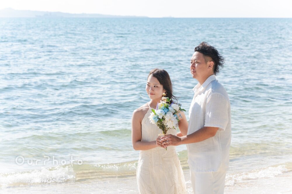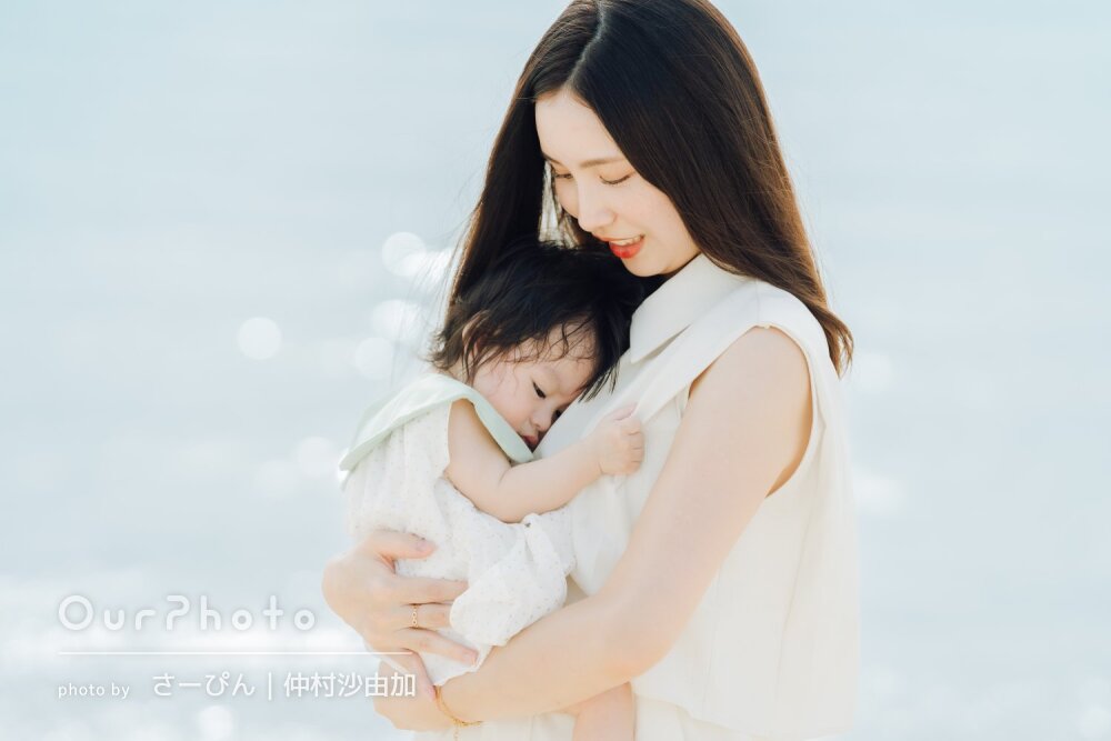 子供も産まれて、この特別な瞬間を綺麗な海と一緒に撮っていただき